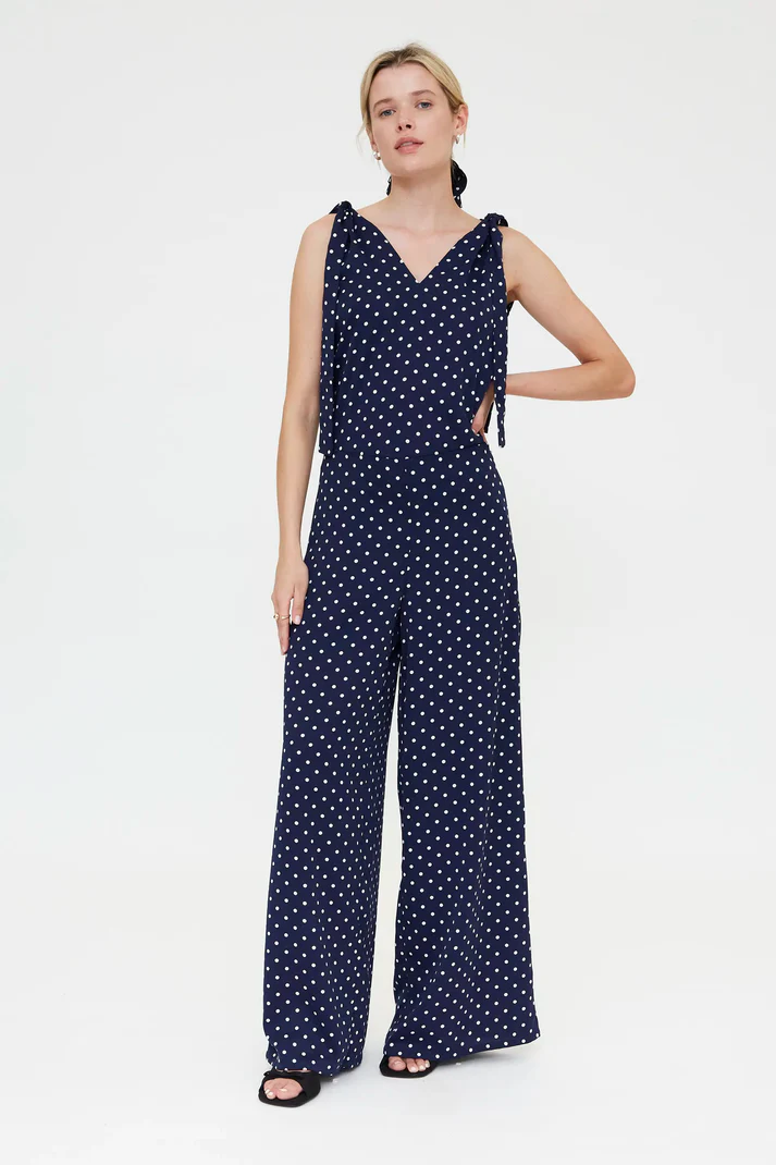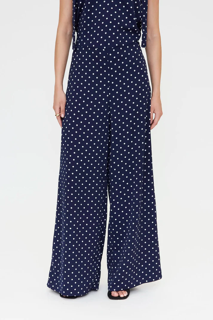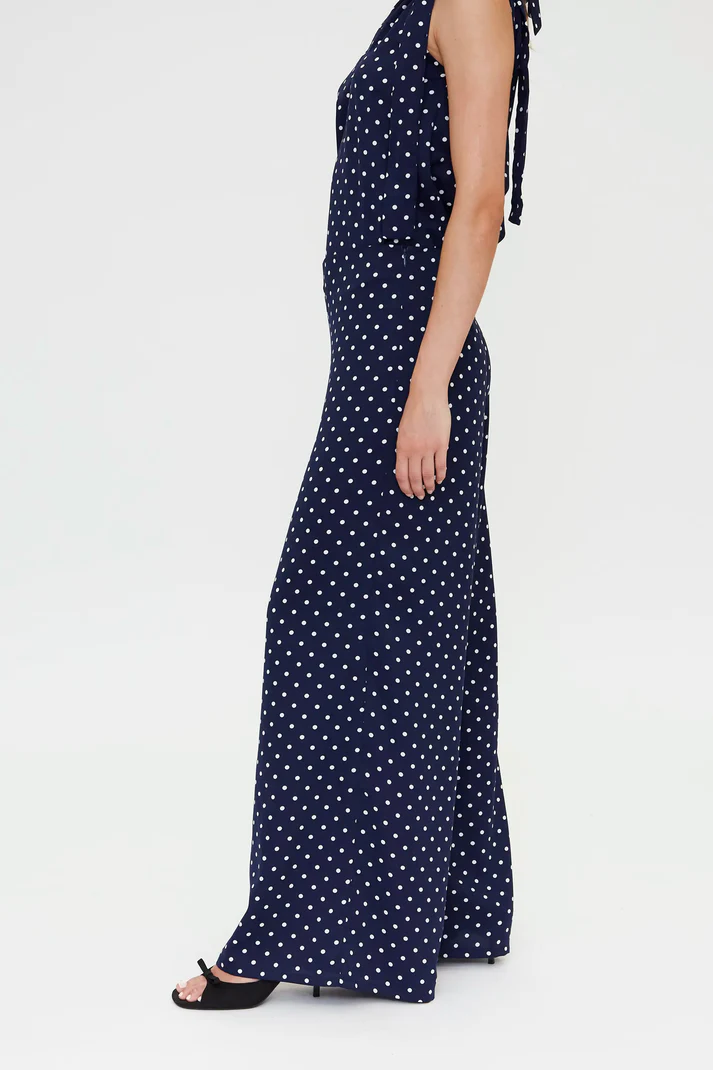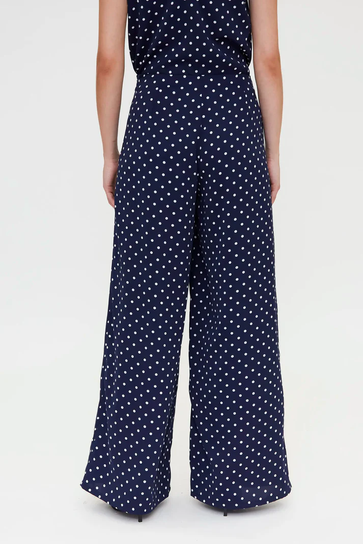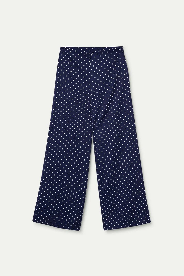 Calça azul-marinho em crepe com estampa de mini bolinhas brancas. Cintura alta, cinto fixo e perna reta. Fecho de zíper invisível.