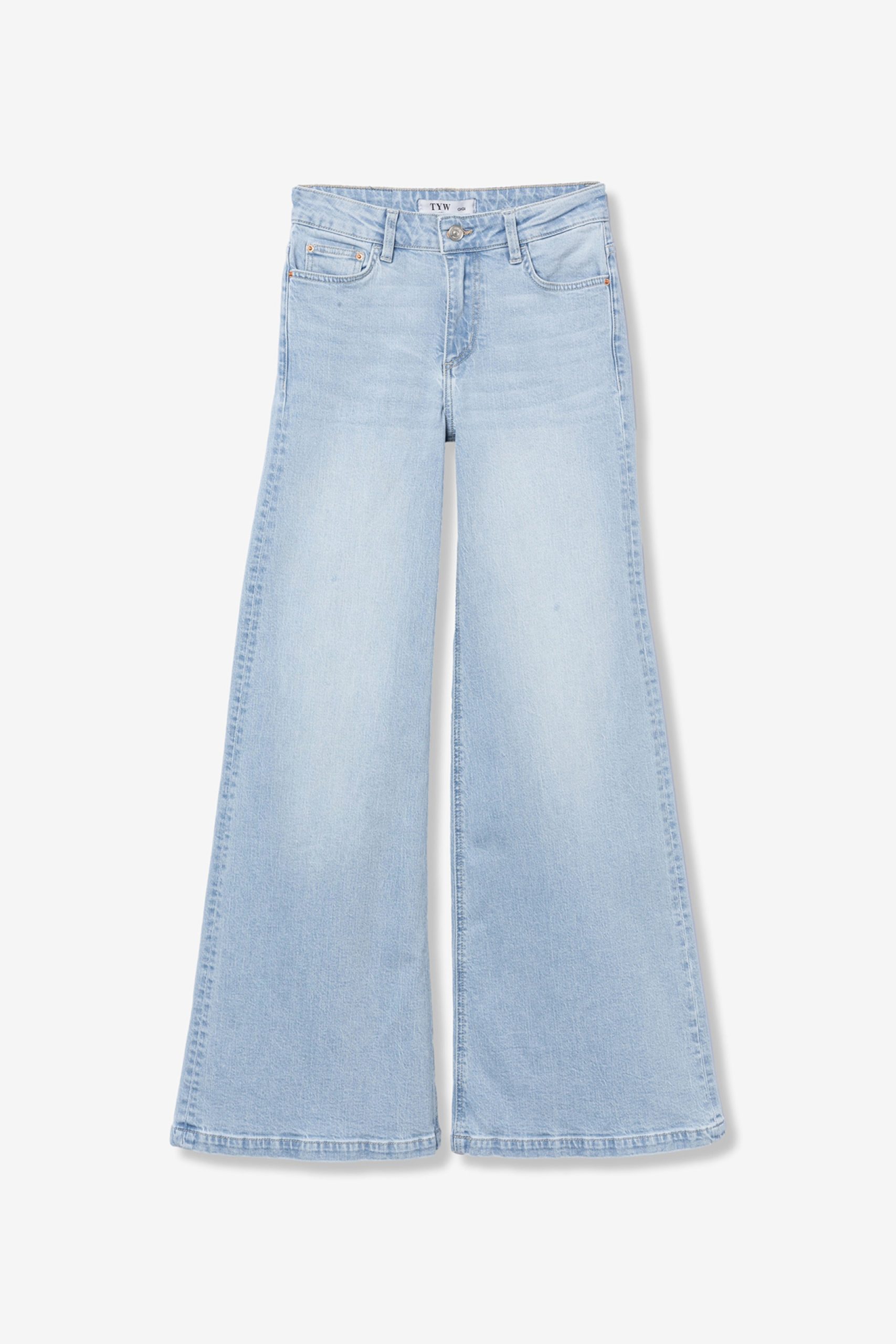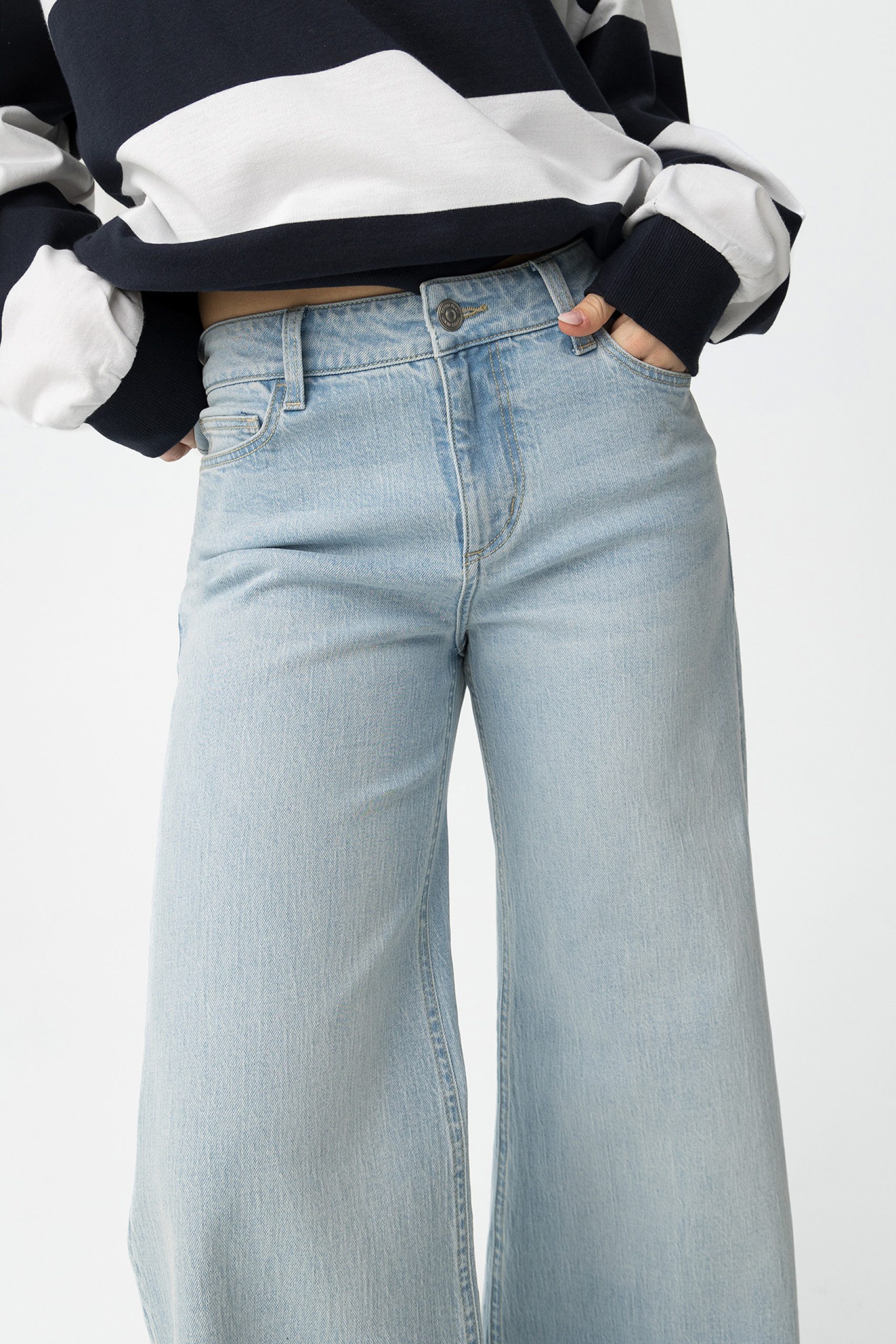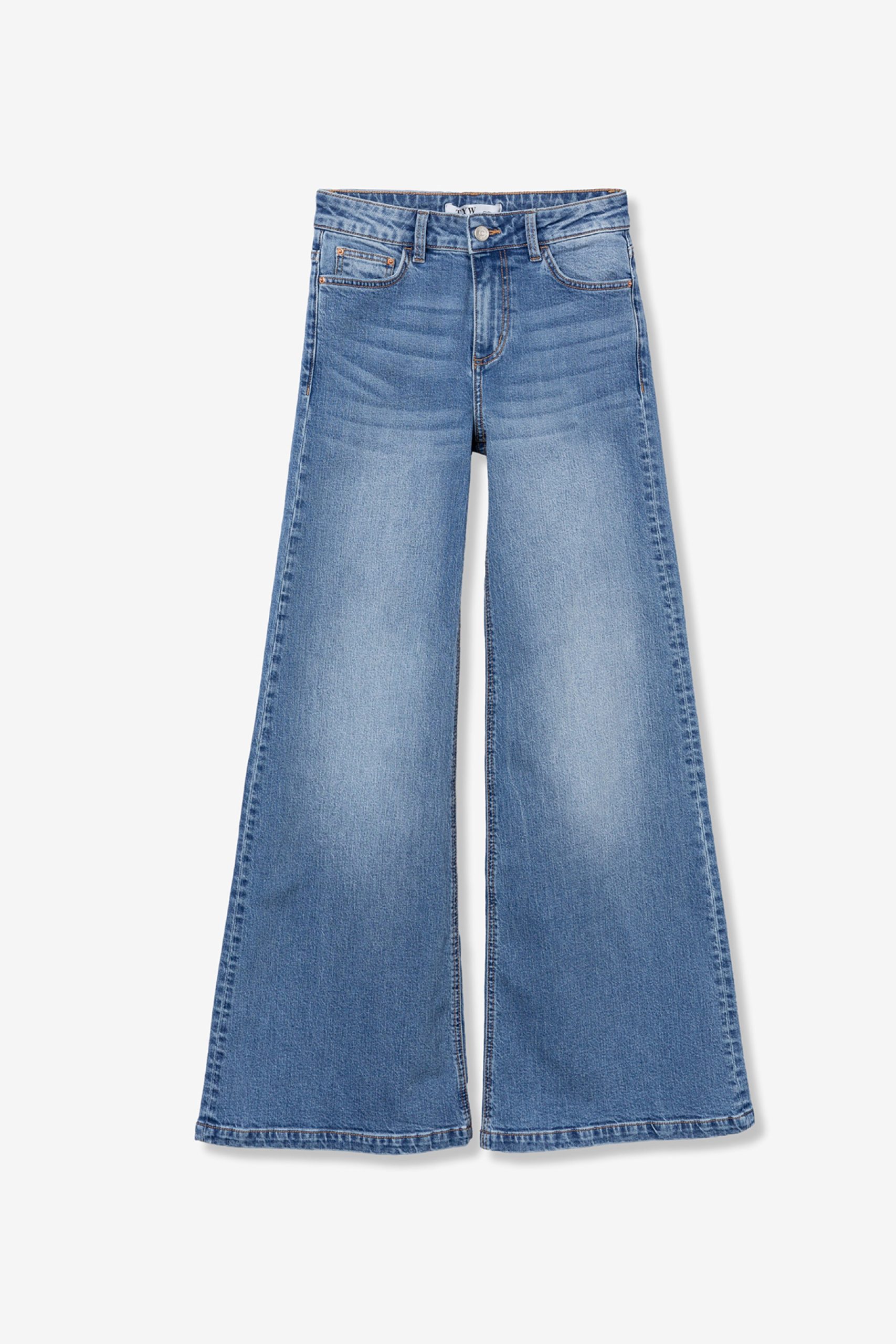Calças de ganga em azul claro com corte largo e pernas flare, estilo descontraído e moderno.