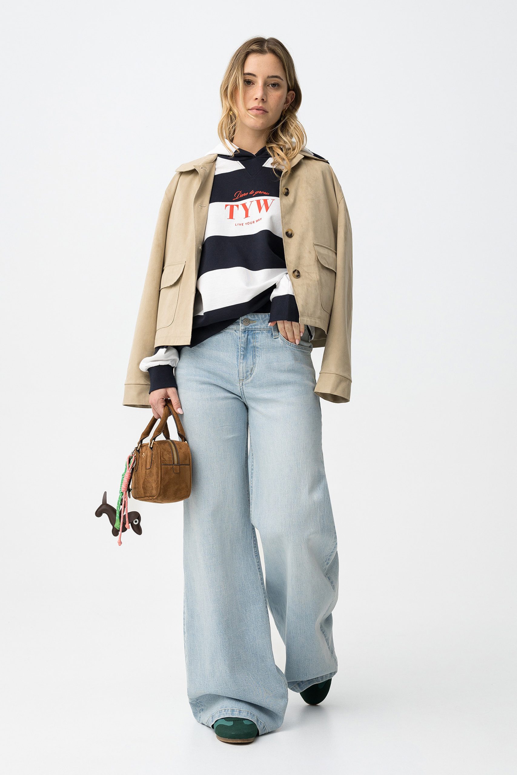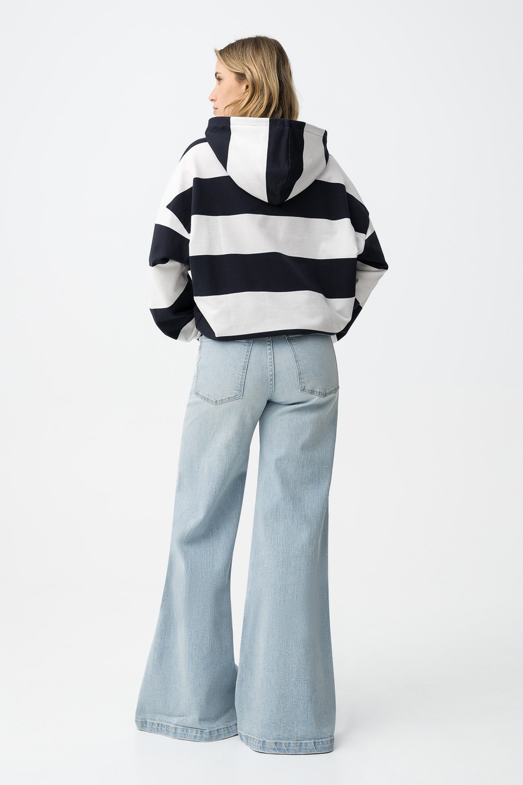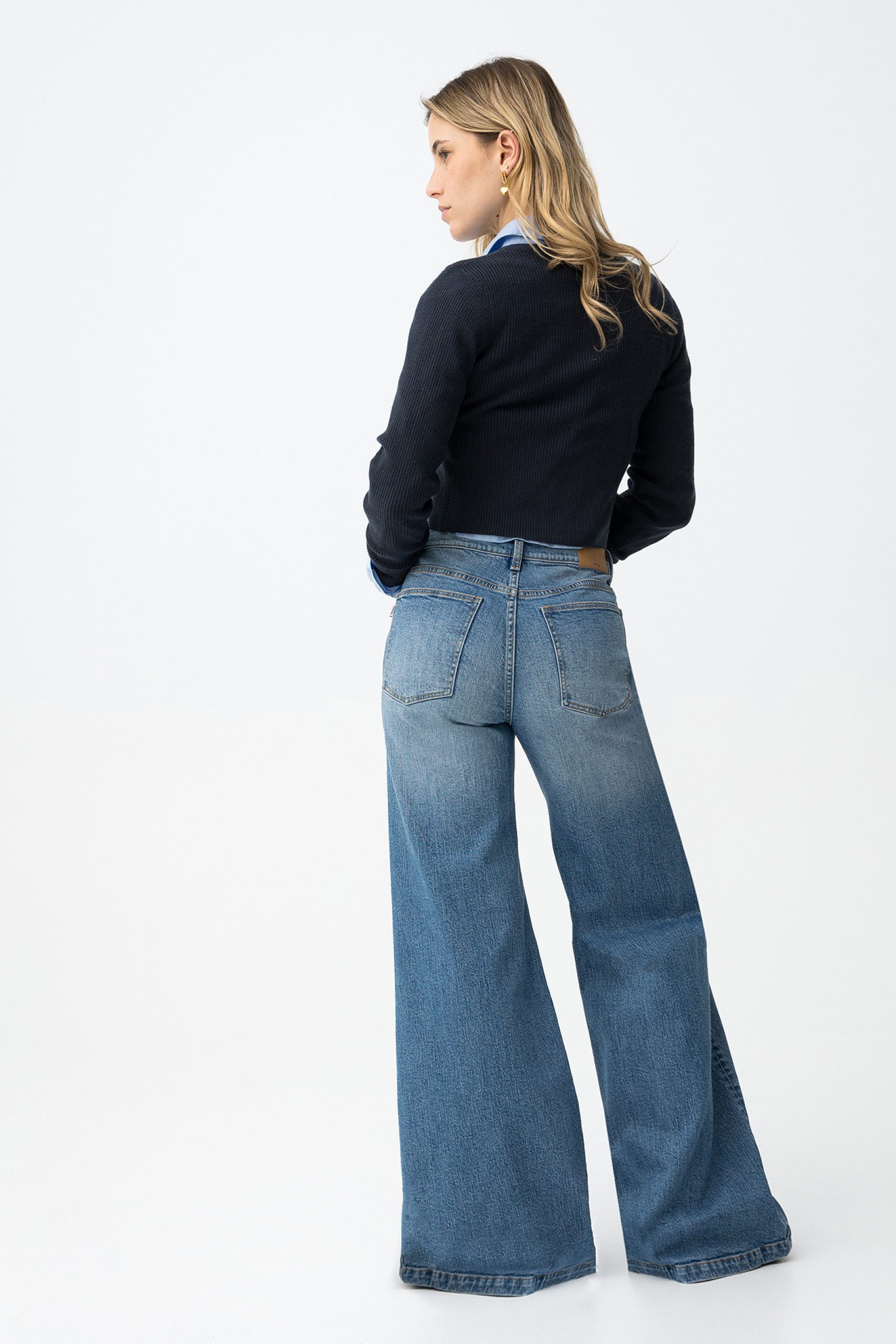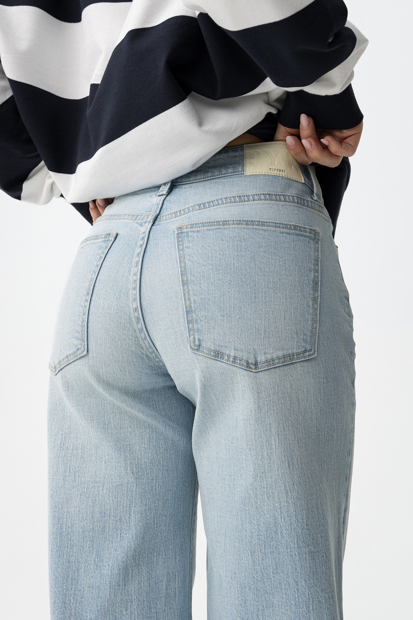 Calças de ganga em azul claro com corte largo e pernas flare, estilo descontraído e moderno.