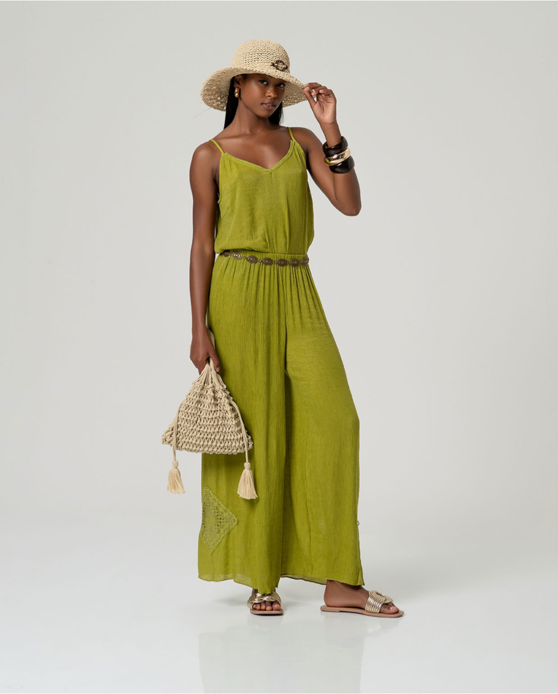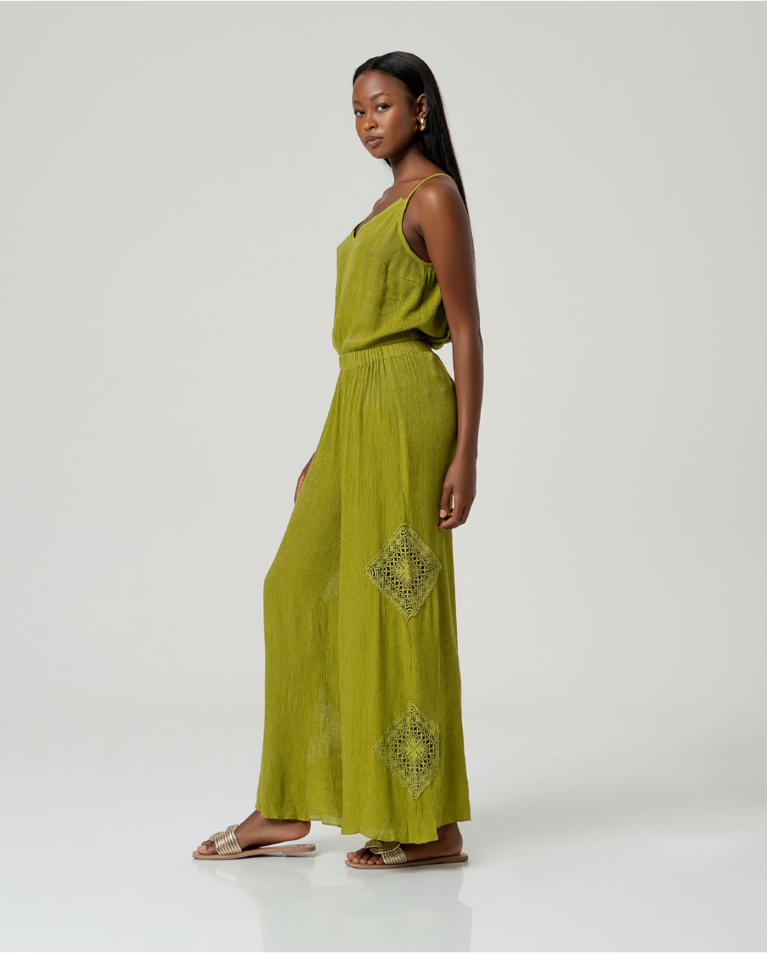 Calça larga de cintura média com perna reta. Design slip-on, com cintura elástica para um ajuste confortável. Ele incorpora bolsos laterais integrados e uma barra reta. Feito de tecido leve com textura sutil e detalhes semitransparentes