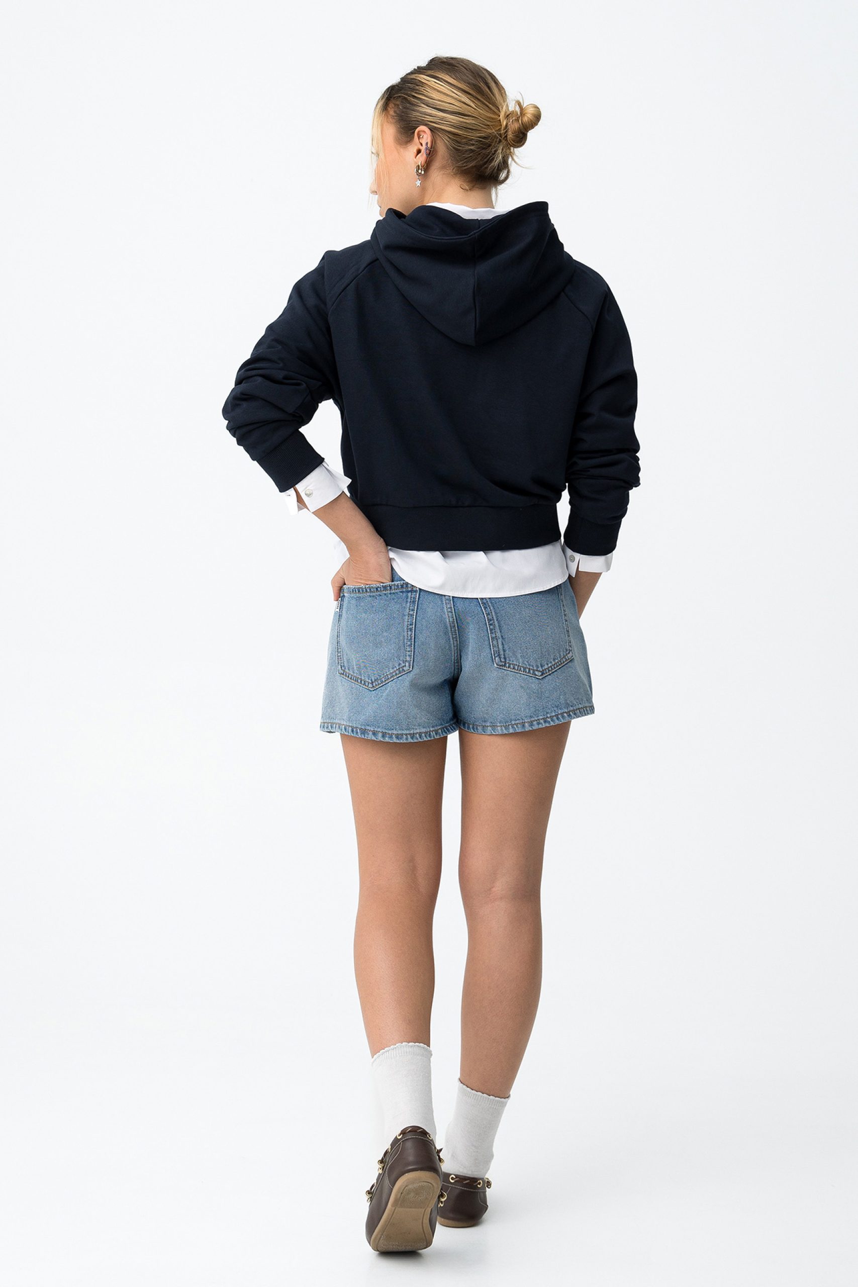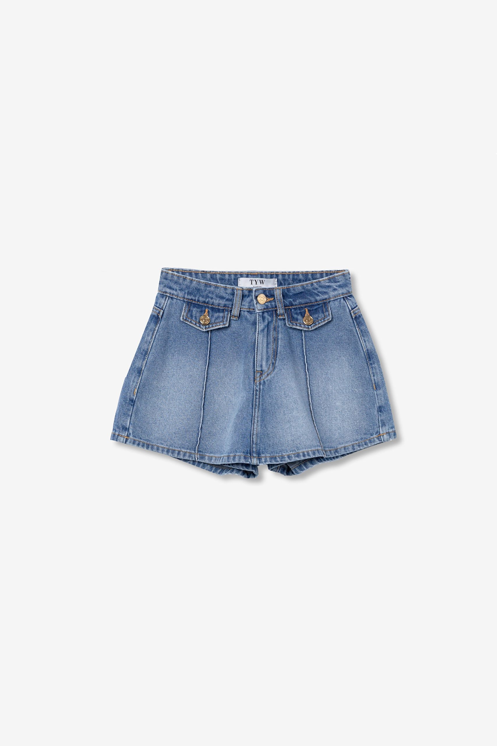 Calções em denim azul claro, corte largo, bolsos frontais com pala e fecho de botão metálico.