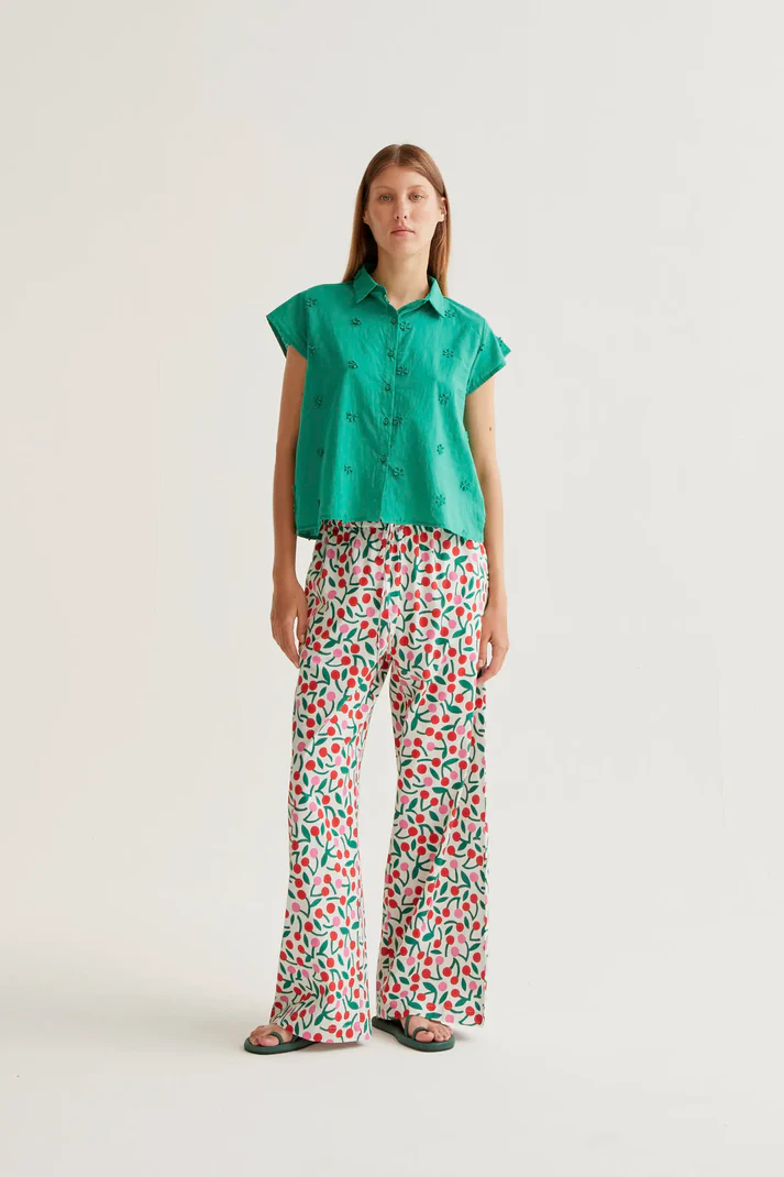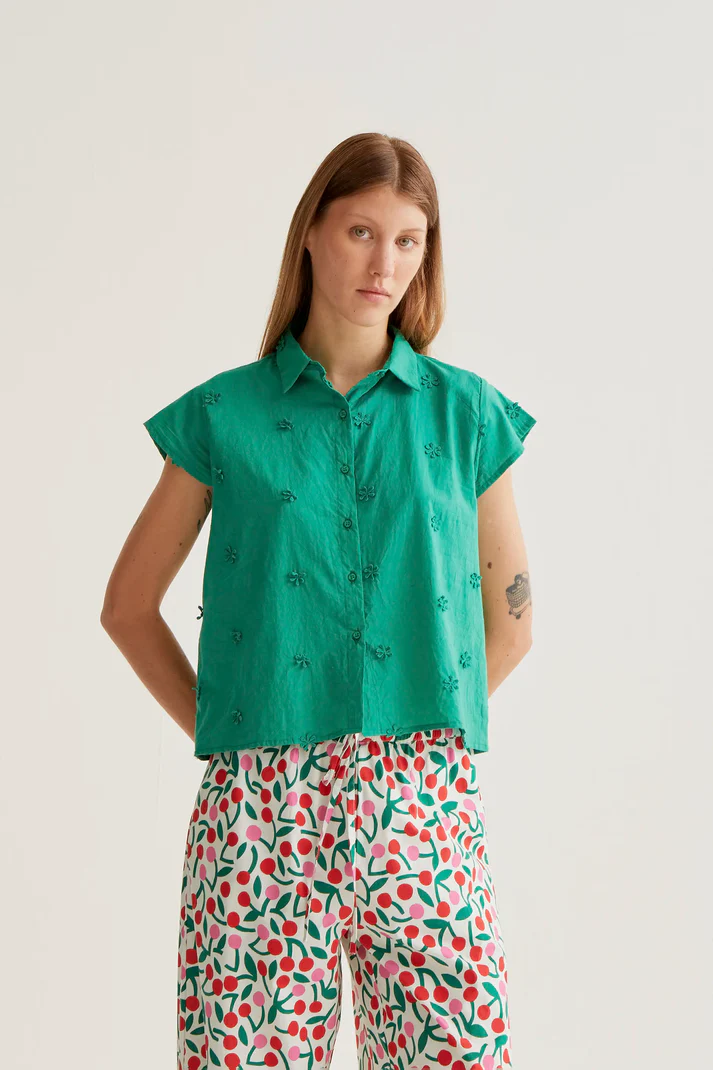 Camisa verde 100% algodão. Gola lapela e mangas curtas. Fecho frontal com botões verdes. Detalhe de flor bordada.