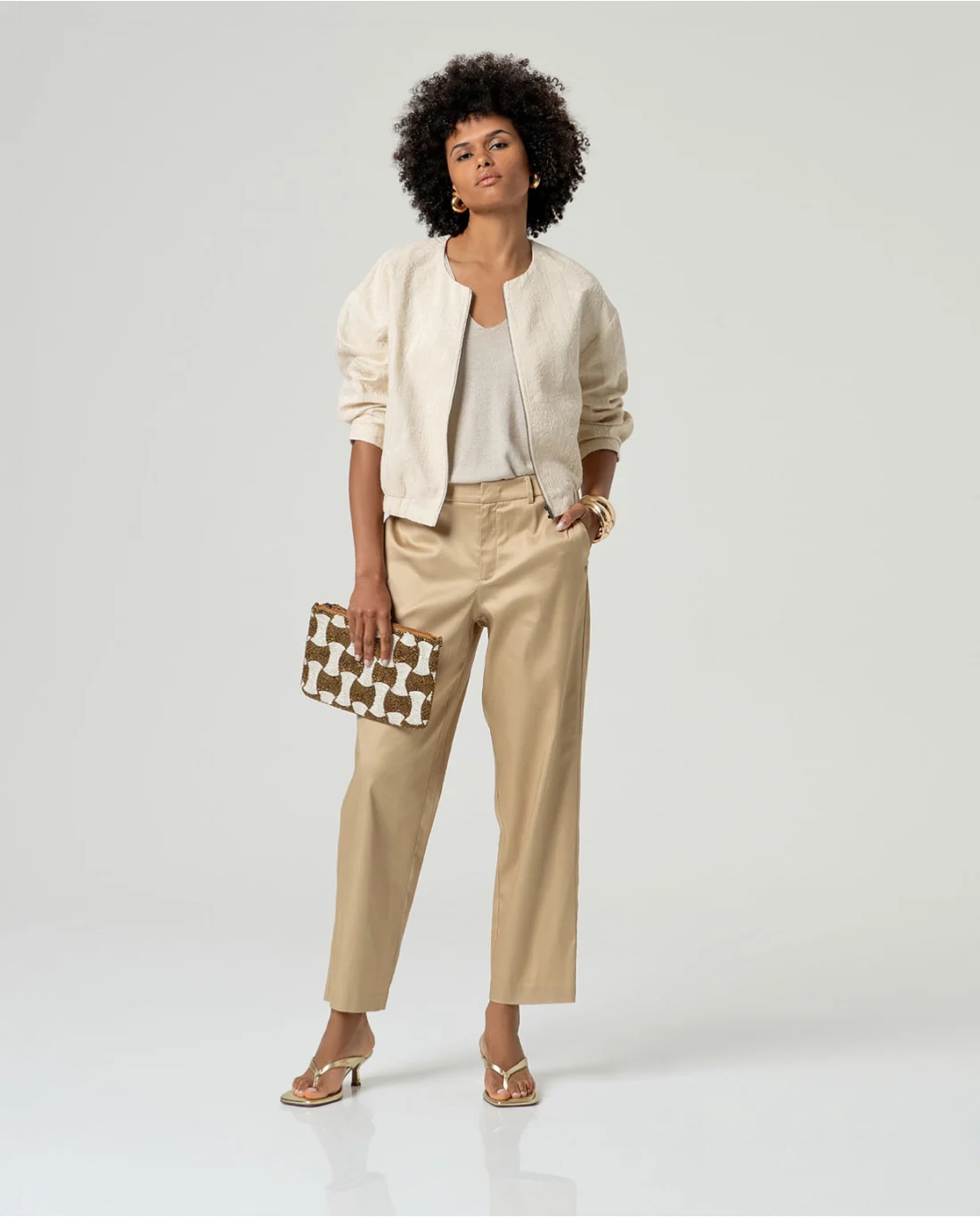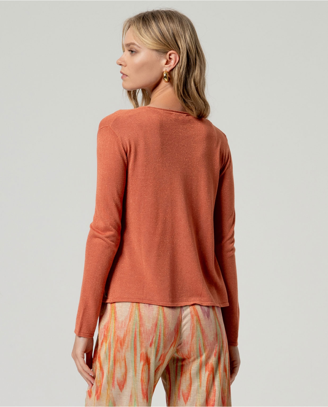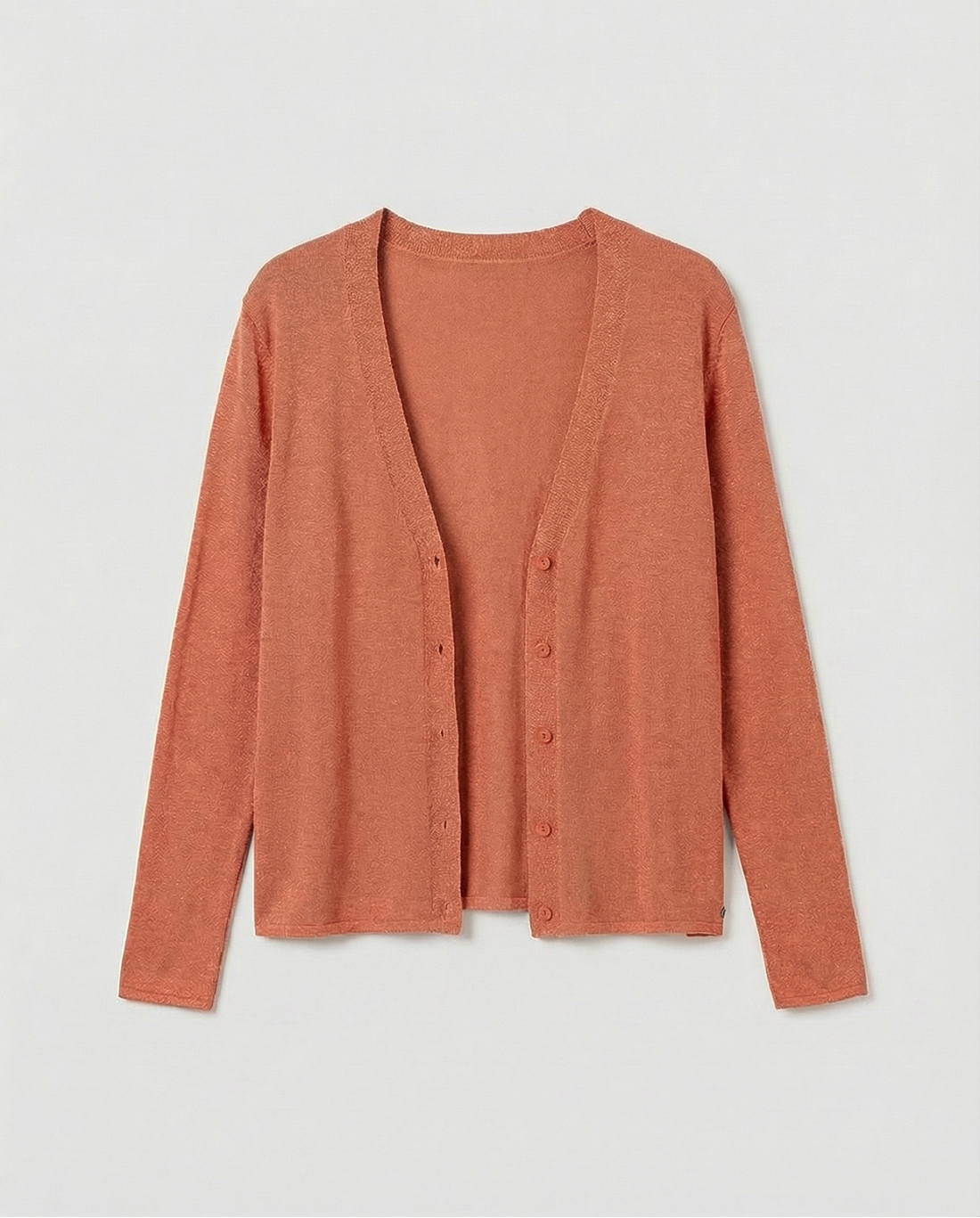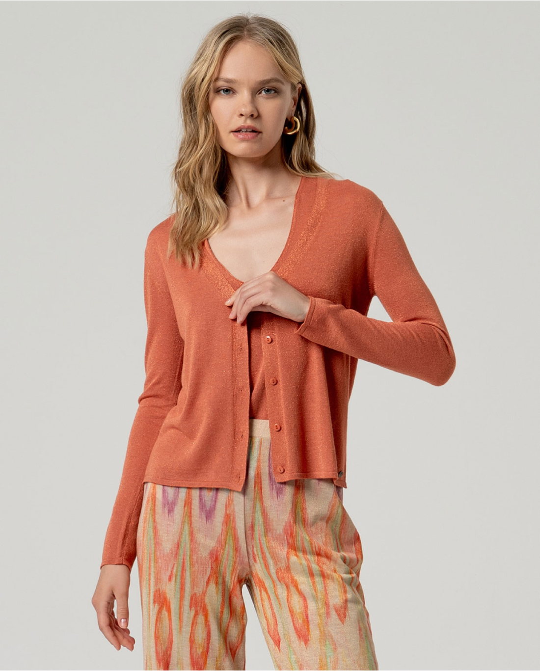 Cardigã de malha fina com decote em V e mangas compridas. Corte reto com fechamento frontal por botões e acabamento canelado. Tecido leve com fio lurex integrado.