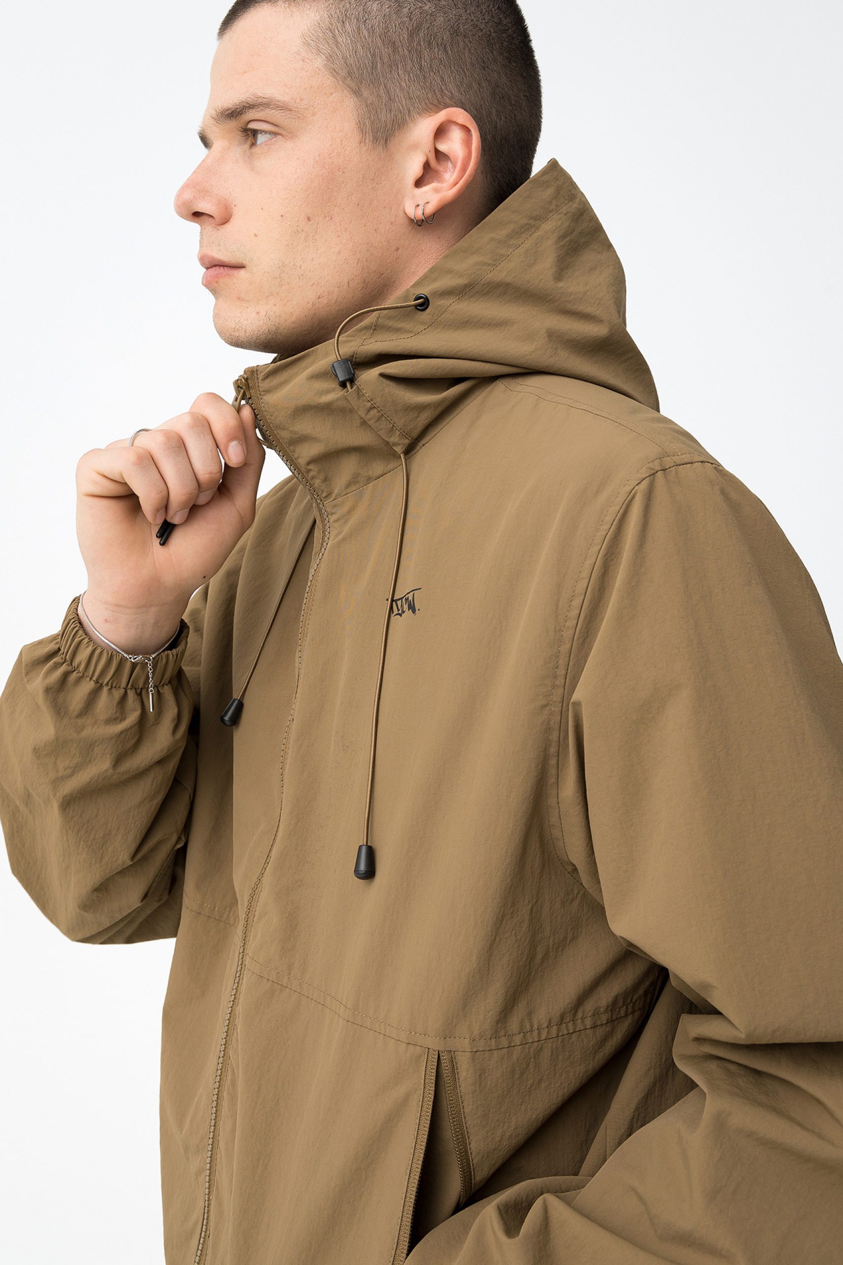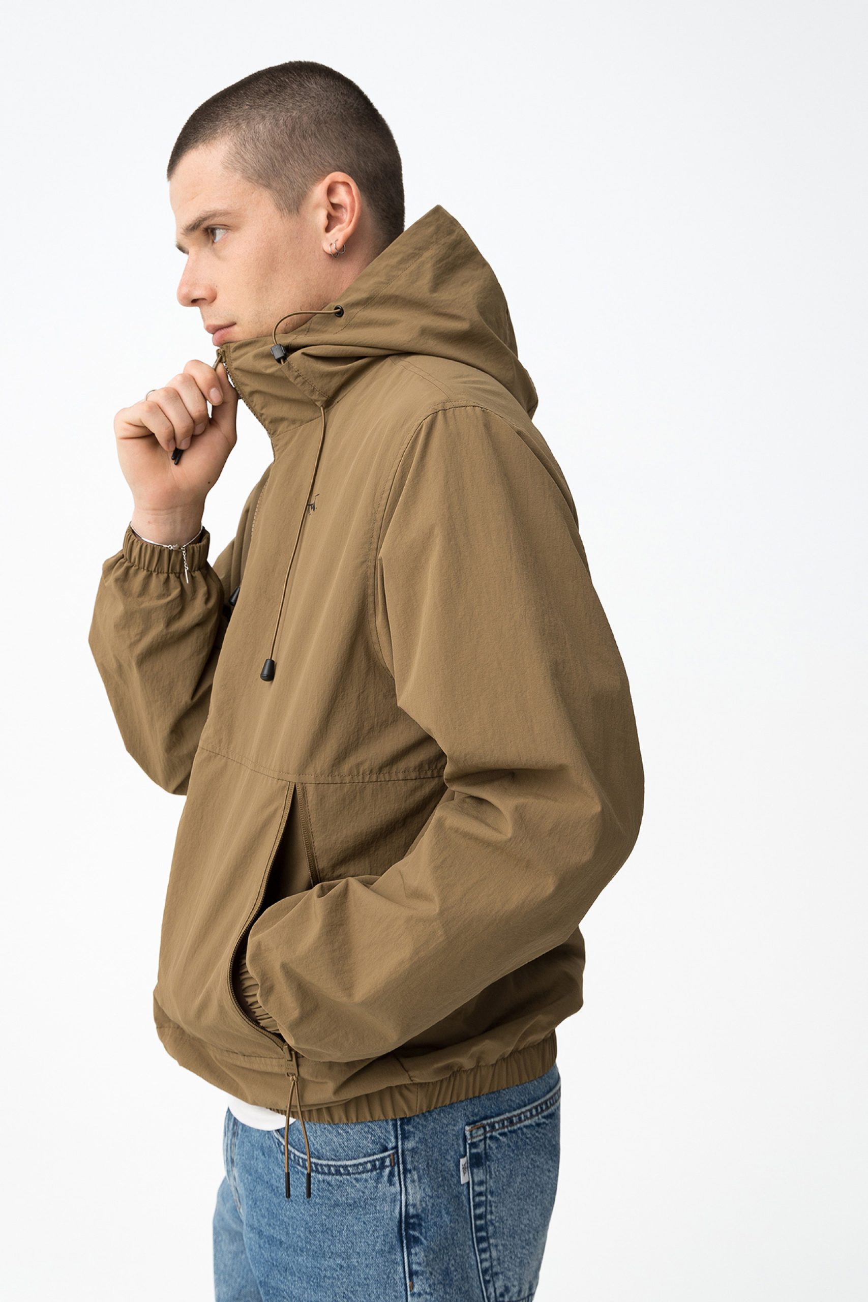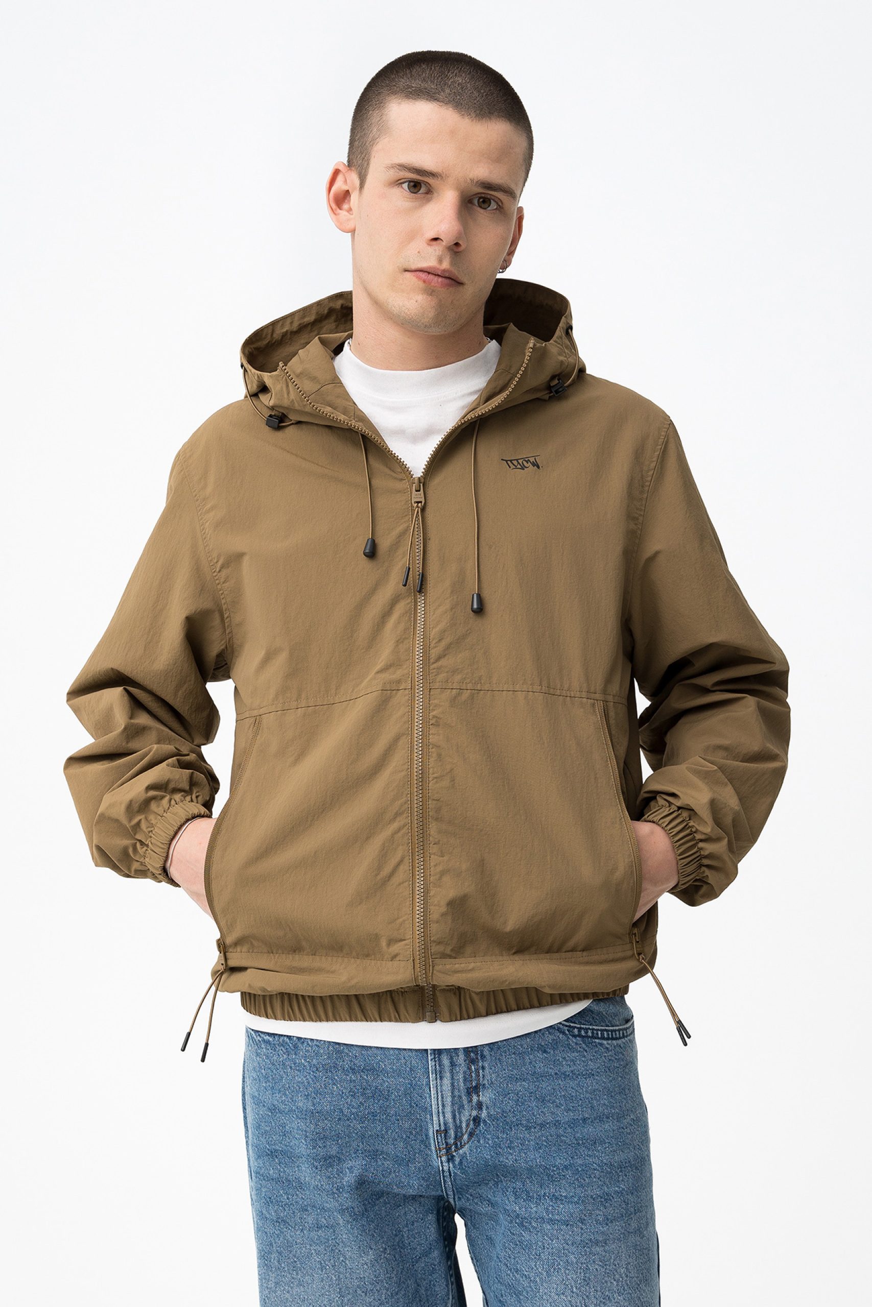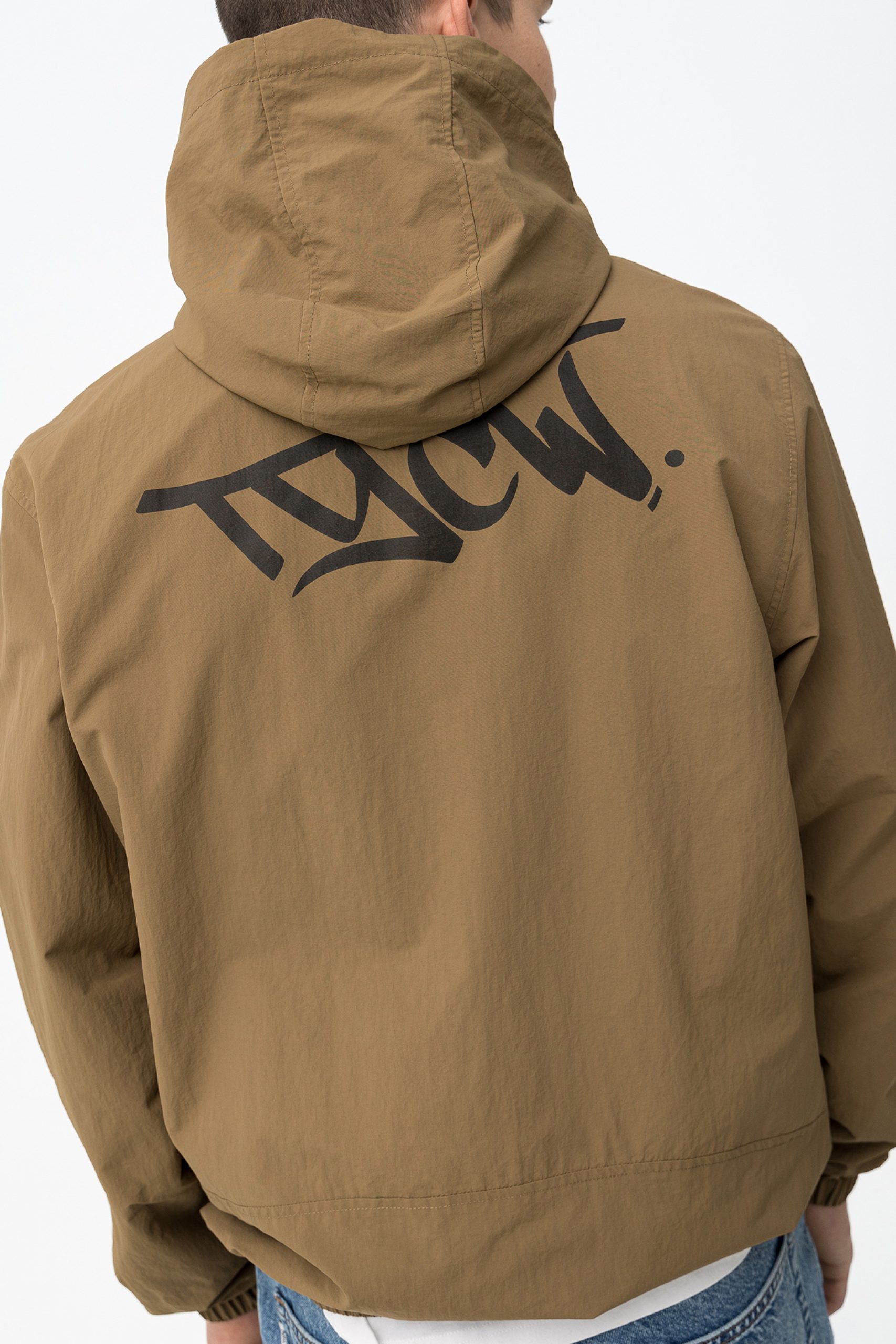 Casaco largo com capuz, fecho à frente, bolsos laterais e estampado nas costas.