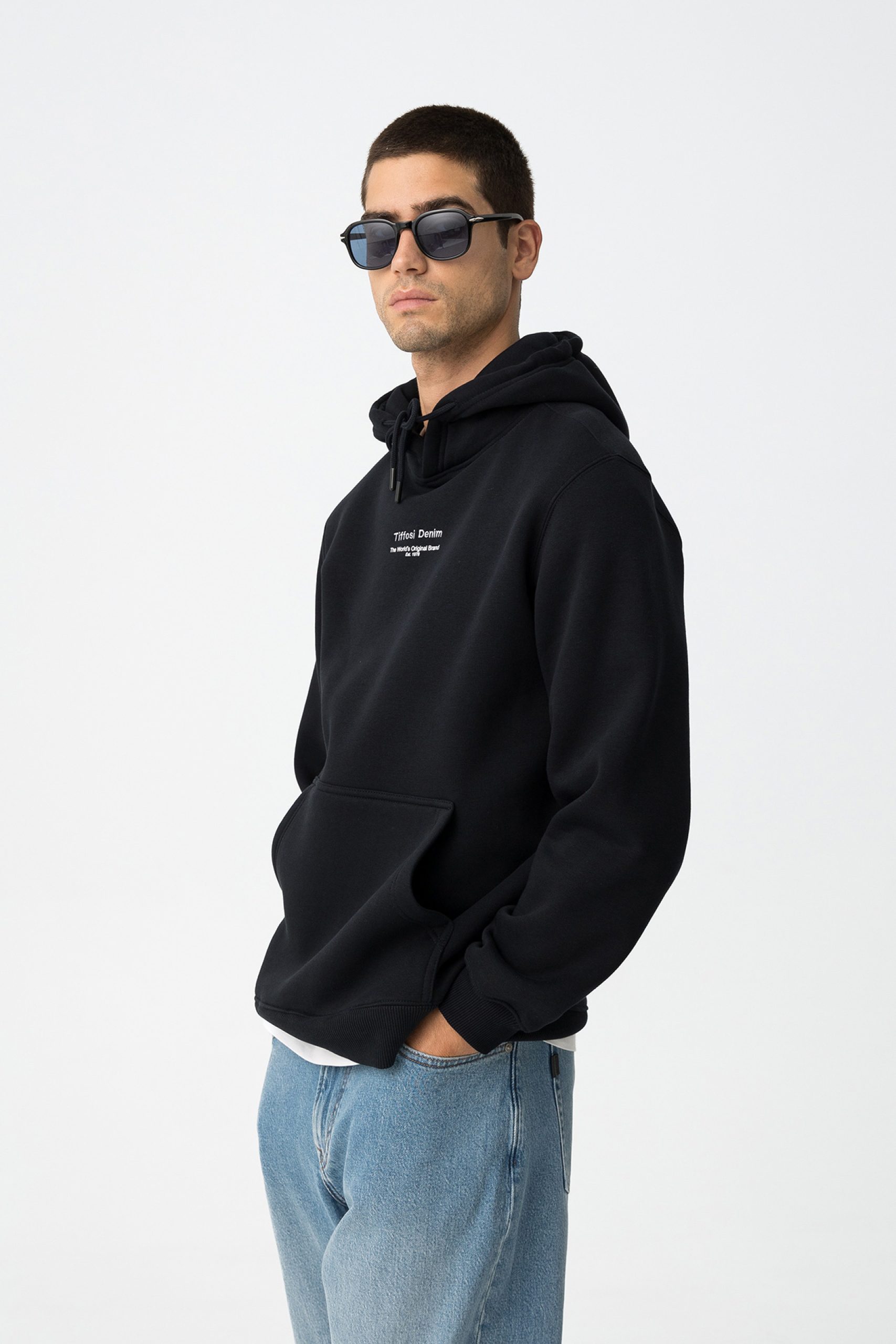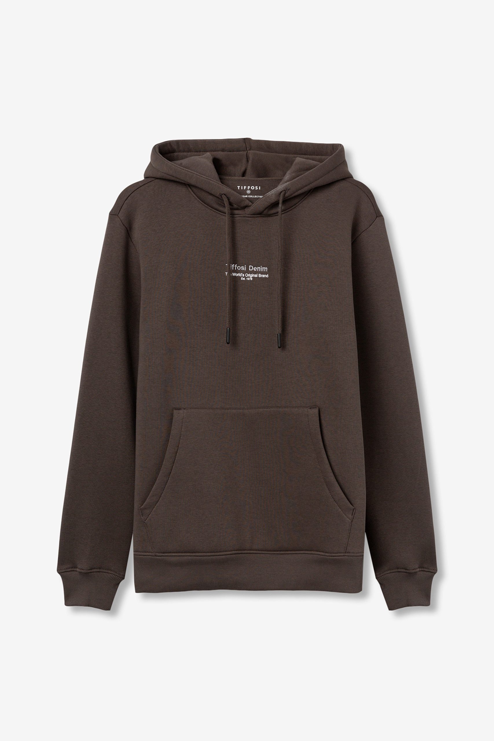 Bolso canguru frontal e pormenor de costura no peito.