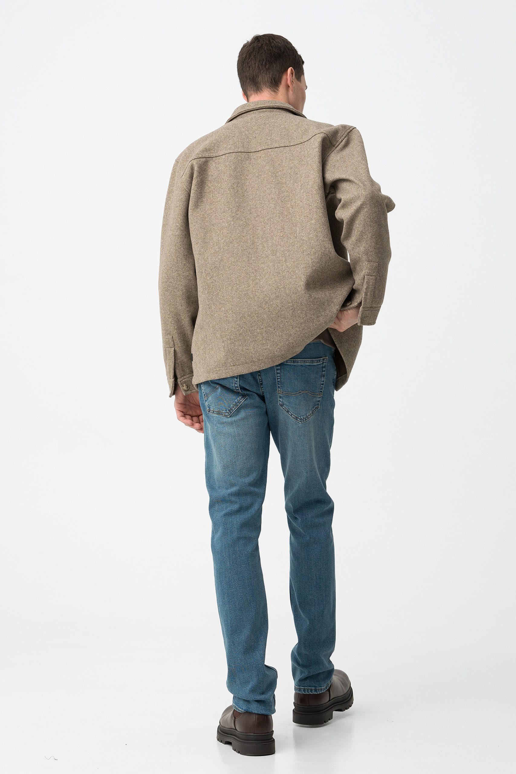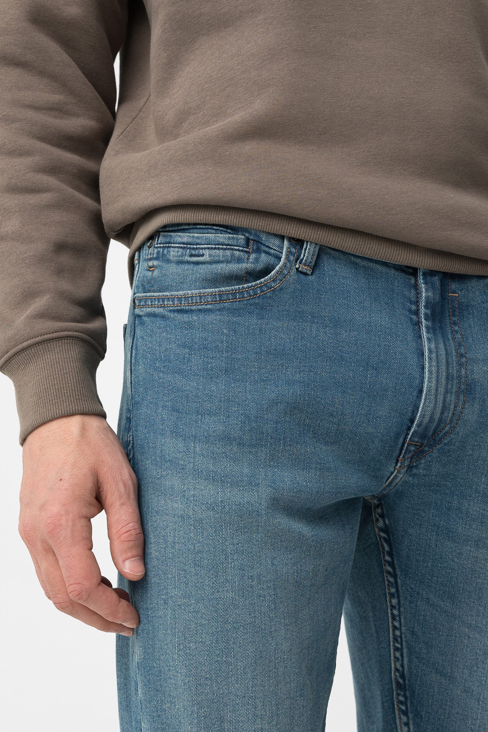 Calças de ganga em azul médio, corte comfort fit, com bolsos traseiros e comprimento total.