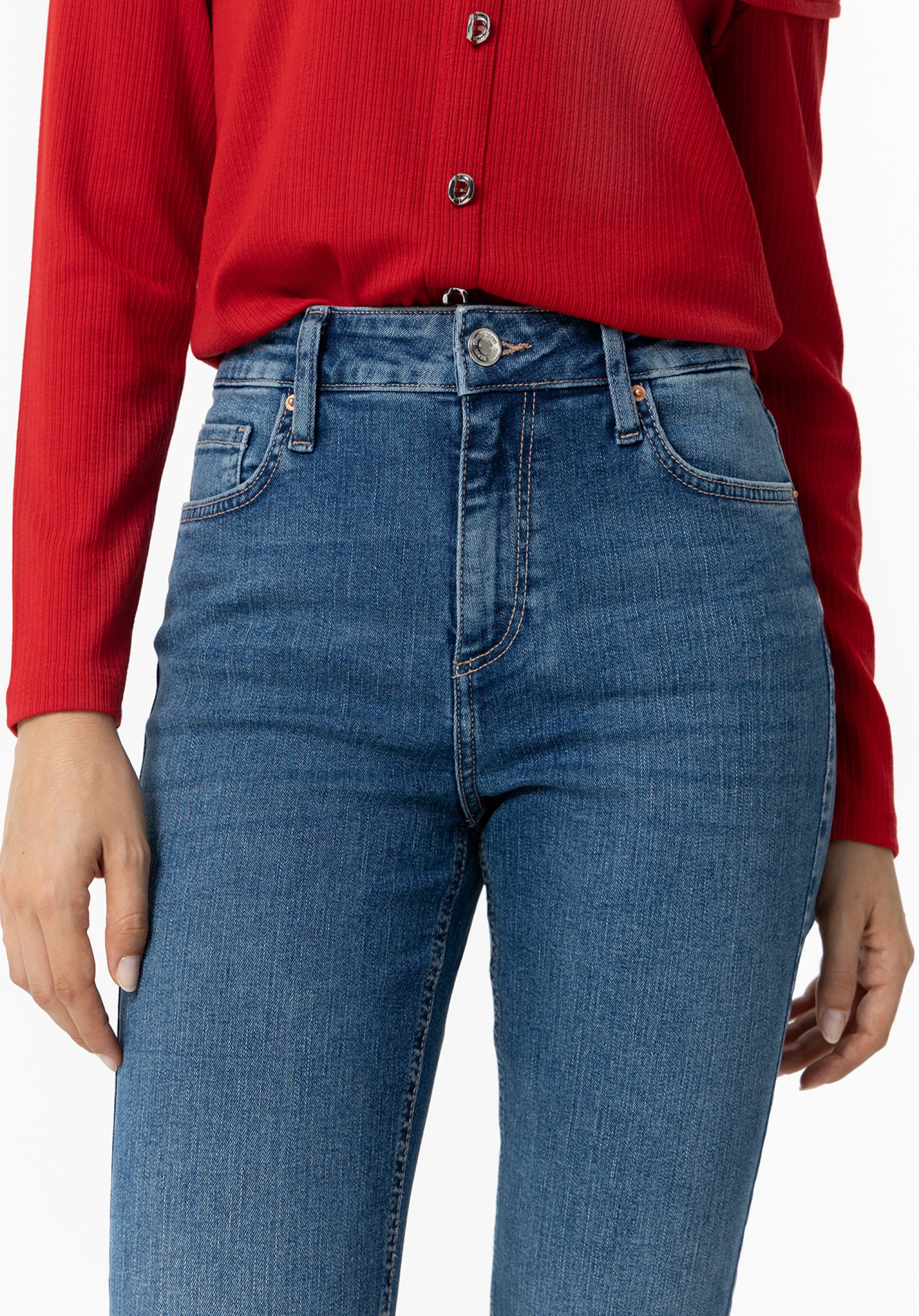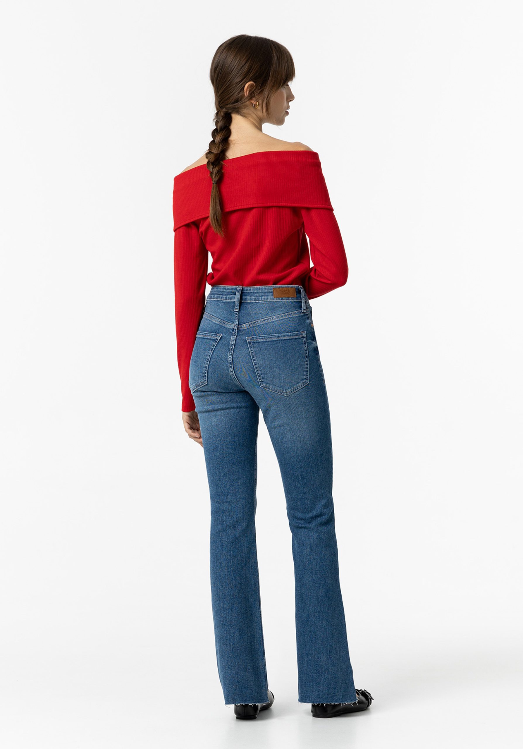 Jeans à boca de sino de cintura alta com cinco bolsos.