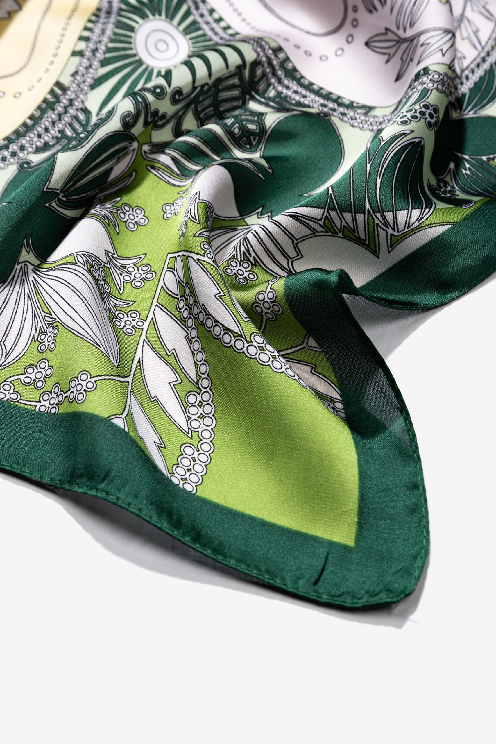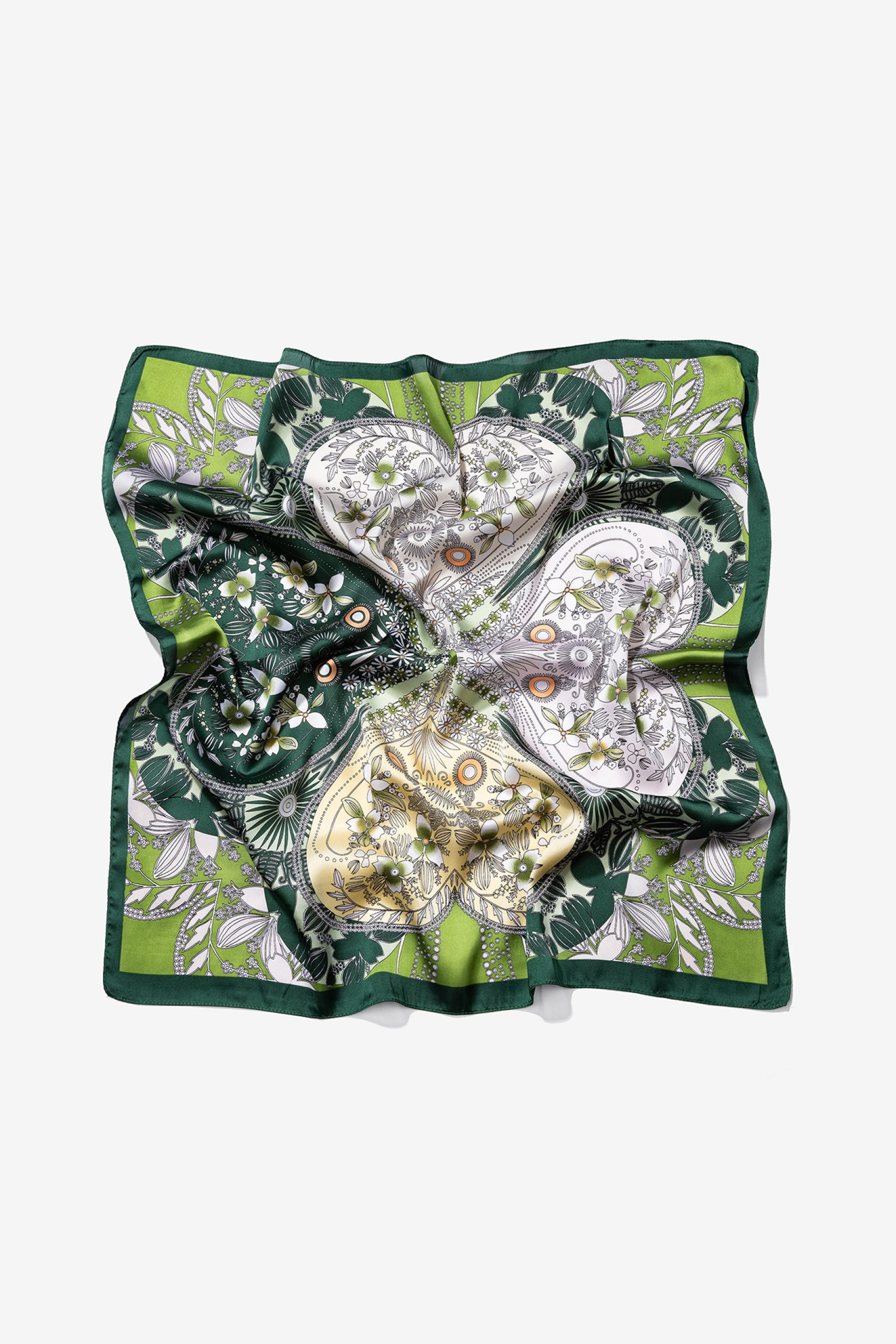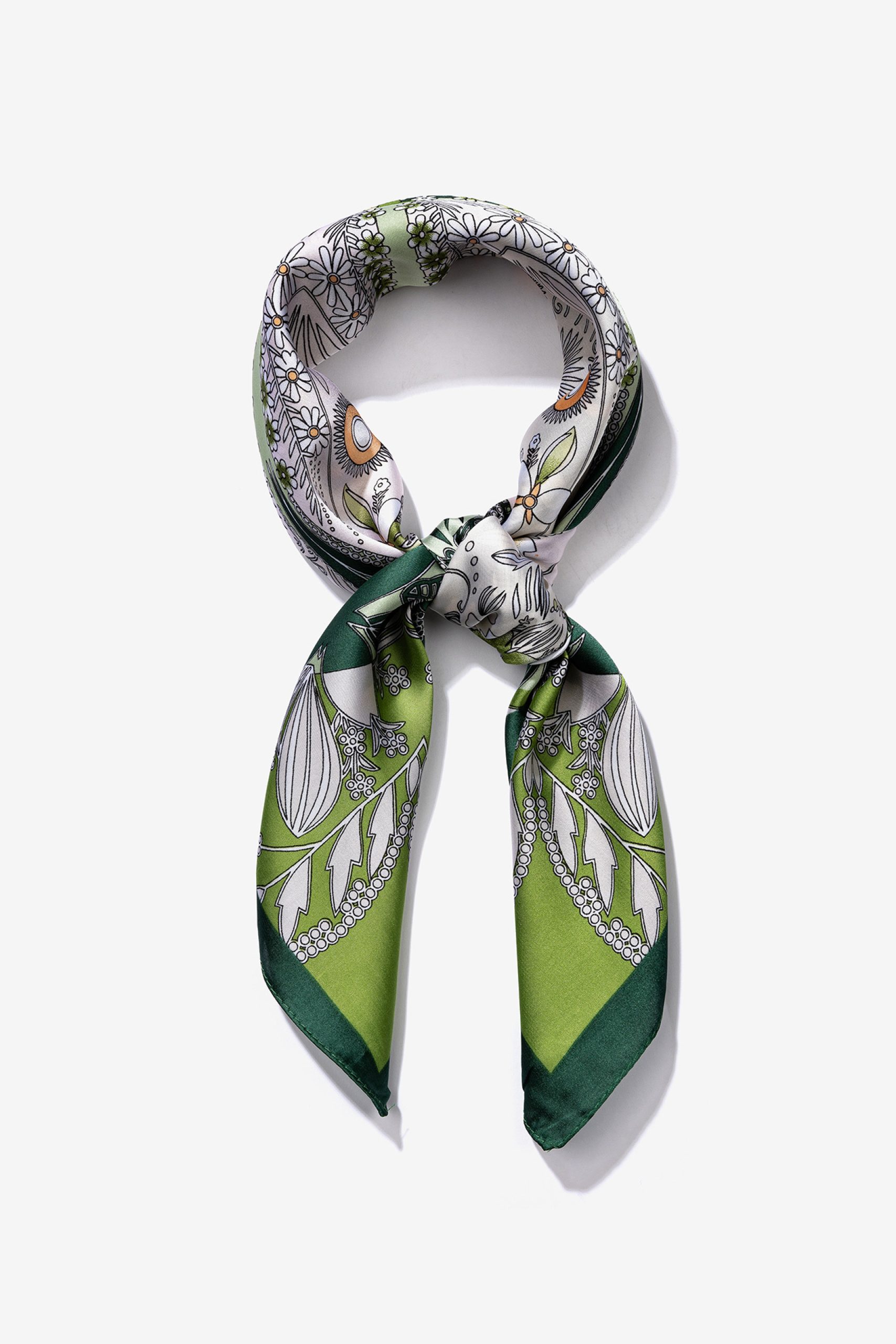 Lenço de cor verde com estampado floral e detalhes geométricos, ideal para um look sofisticado.