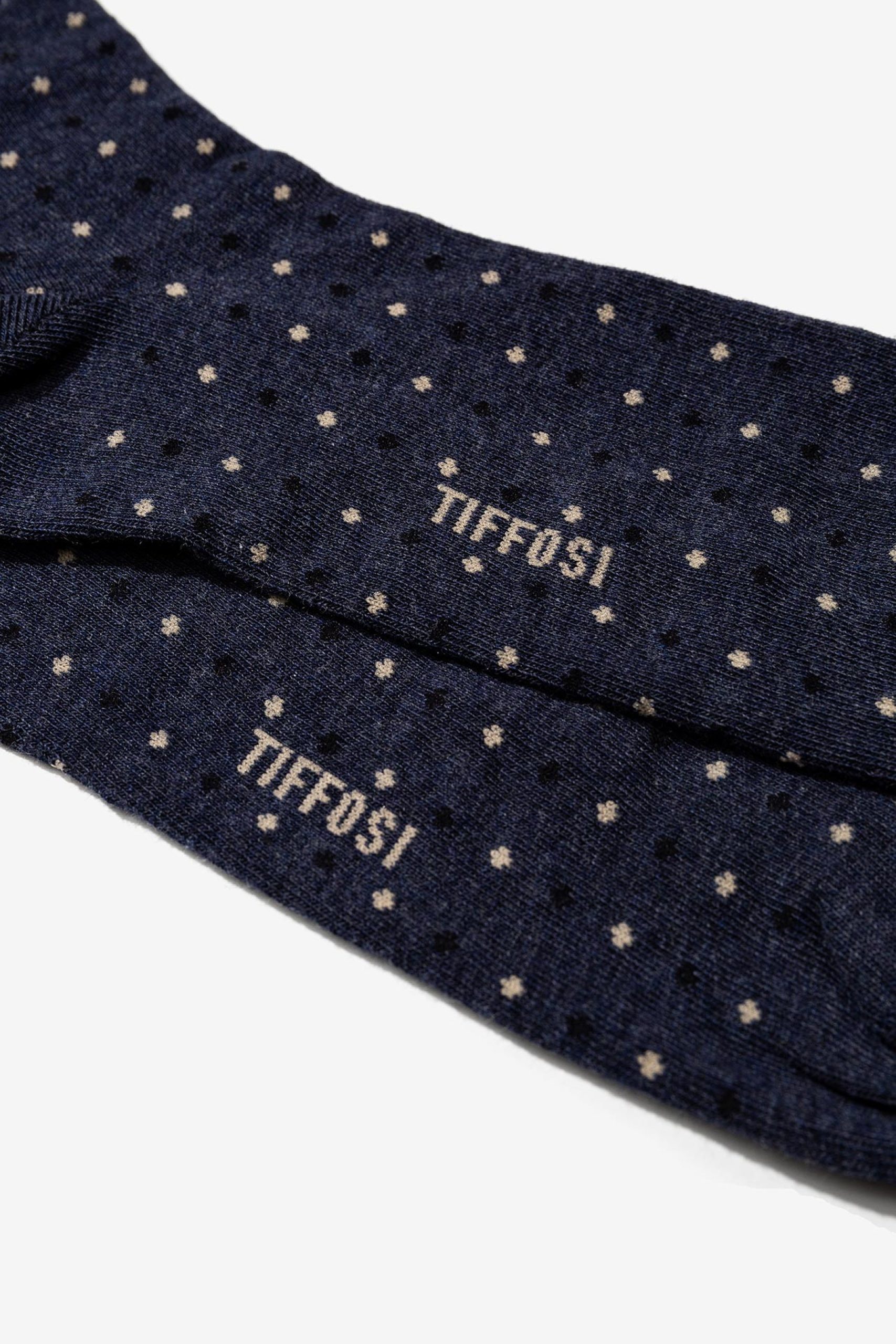Meias com padrão de pequenos pontos claros e detalhe de logótipo discreto.