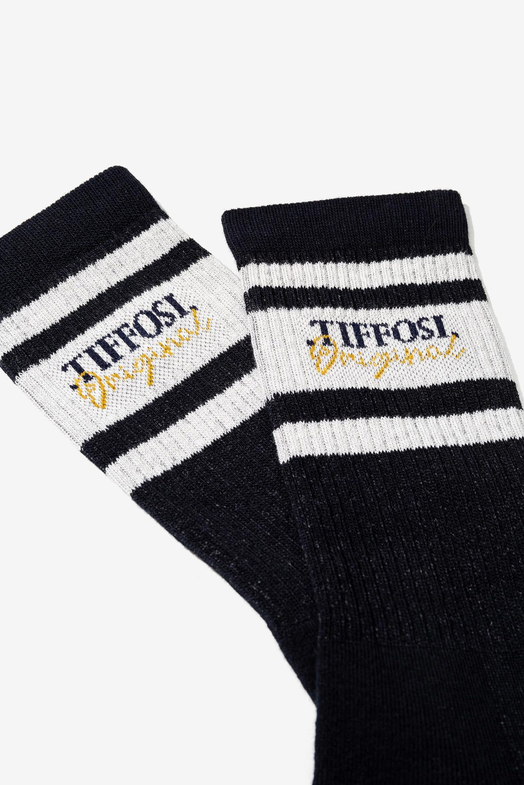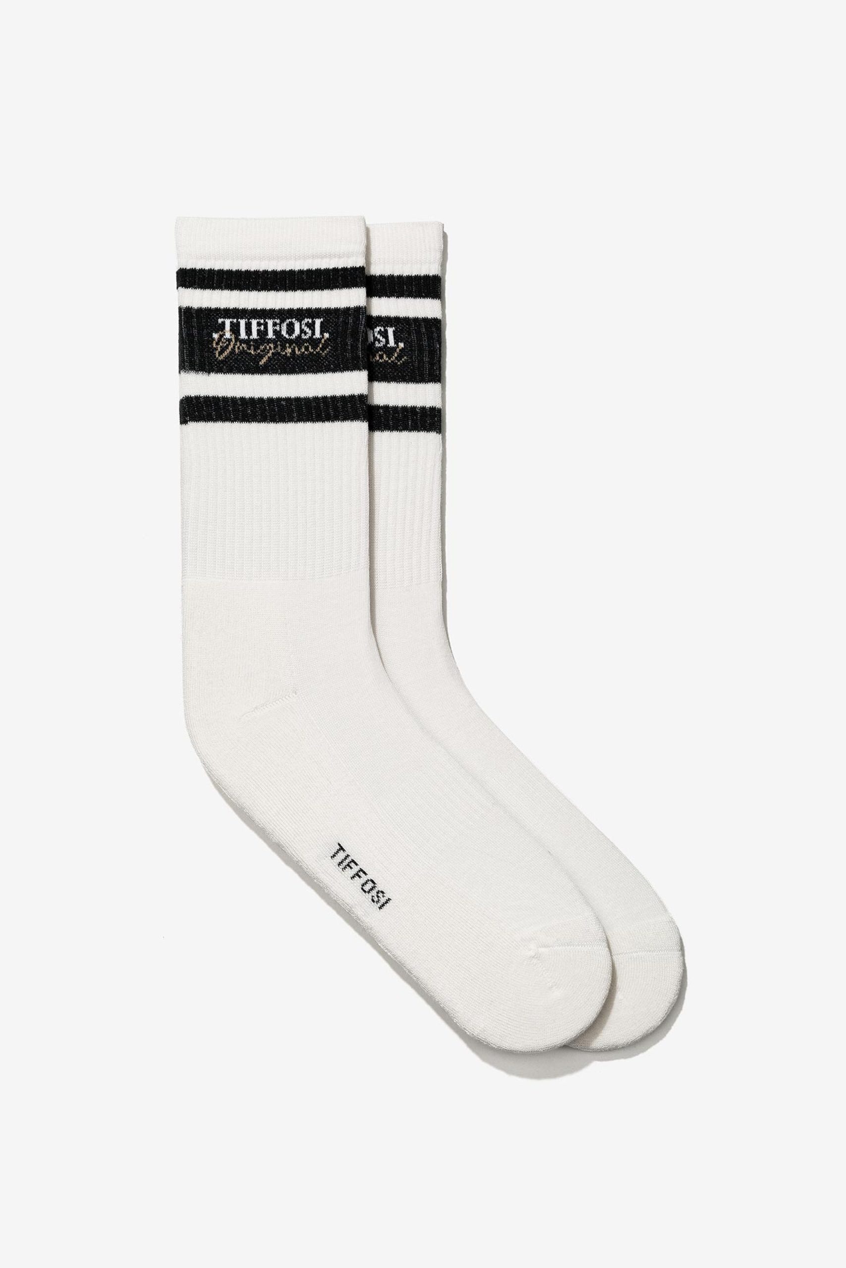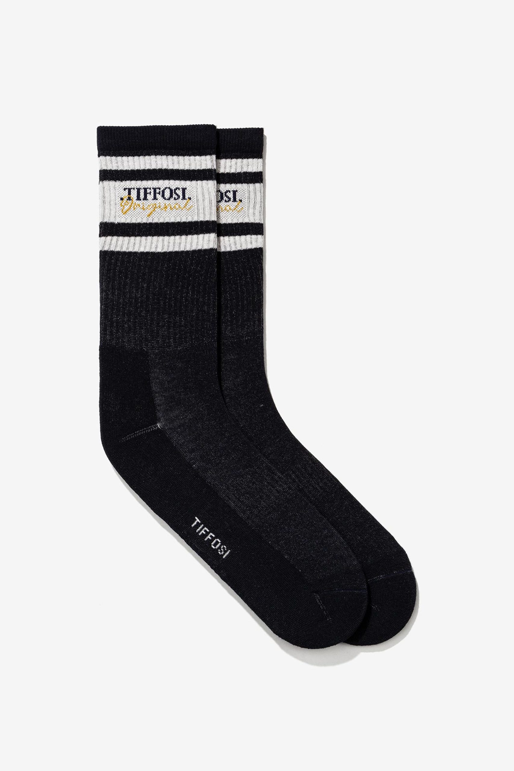 Meias com riscas brancas e detalhe de logotipo bordado.