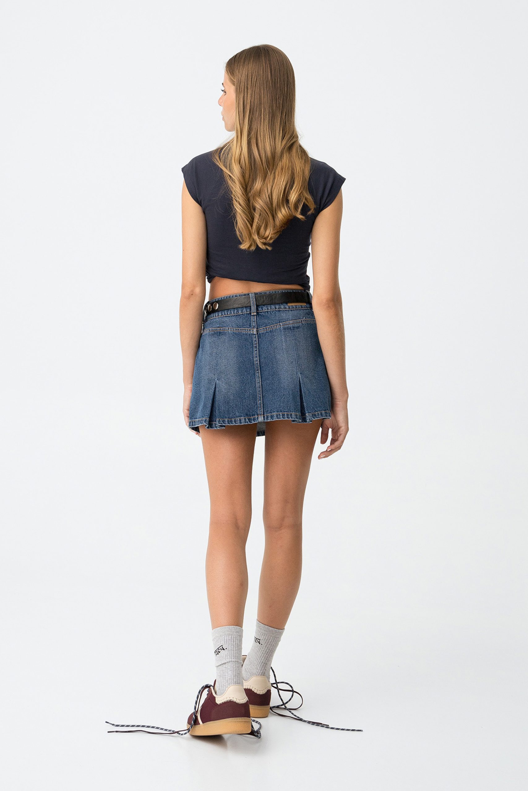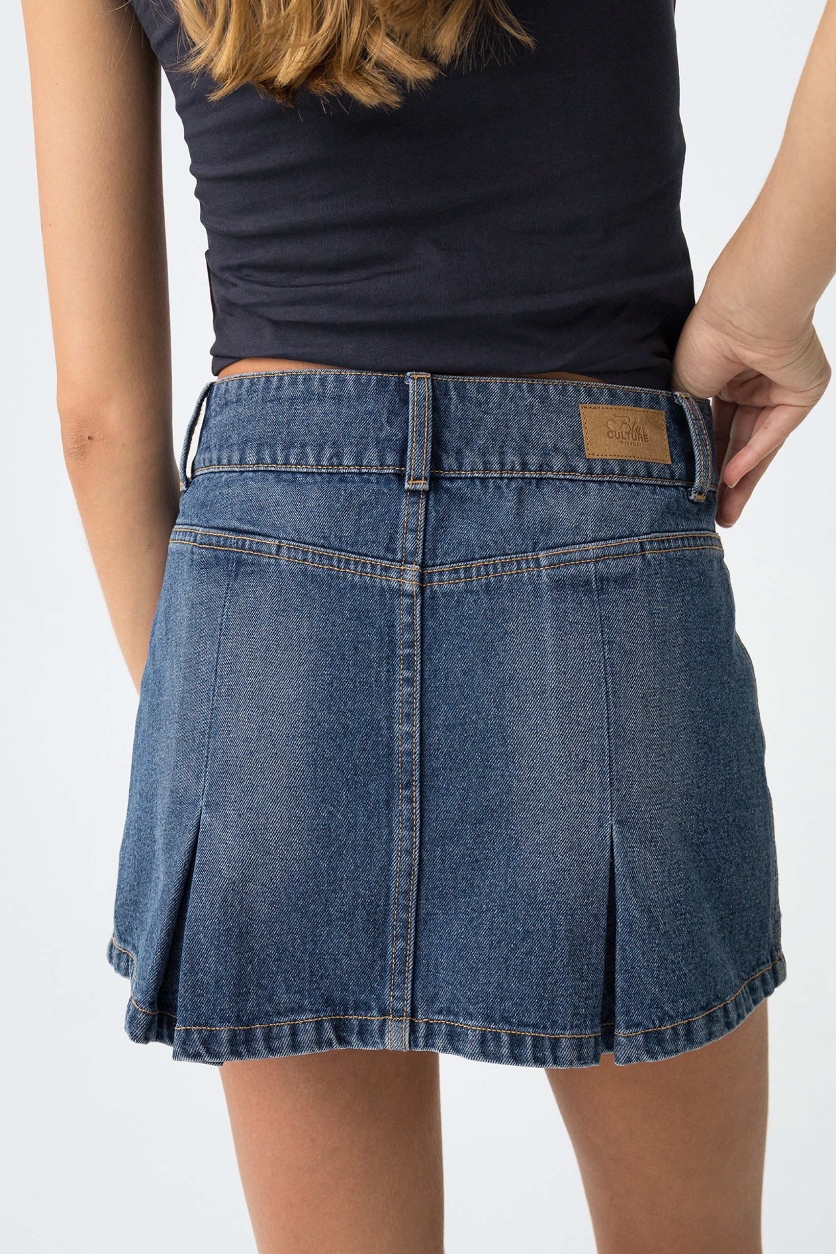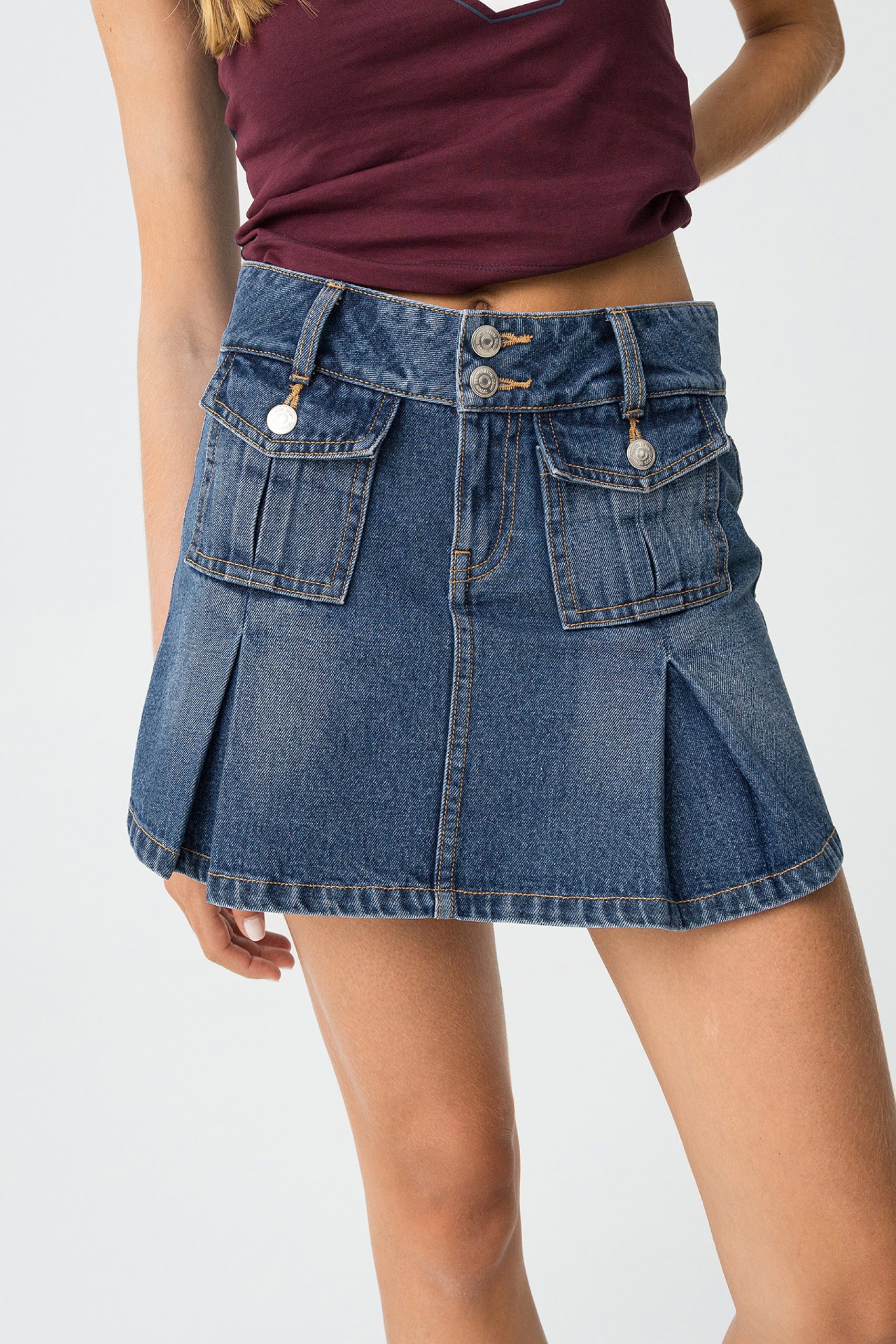 Minissaia em ganga com bolsos frontais e detalhes em botões metálicos.