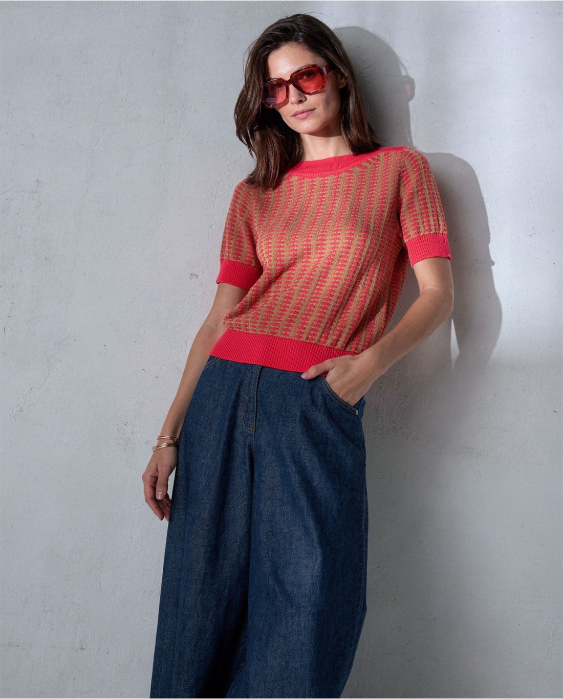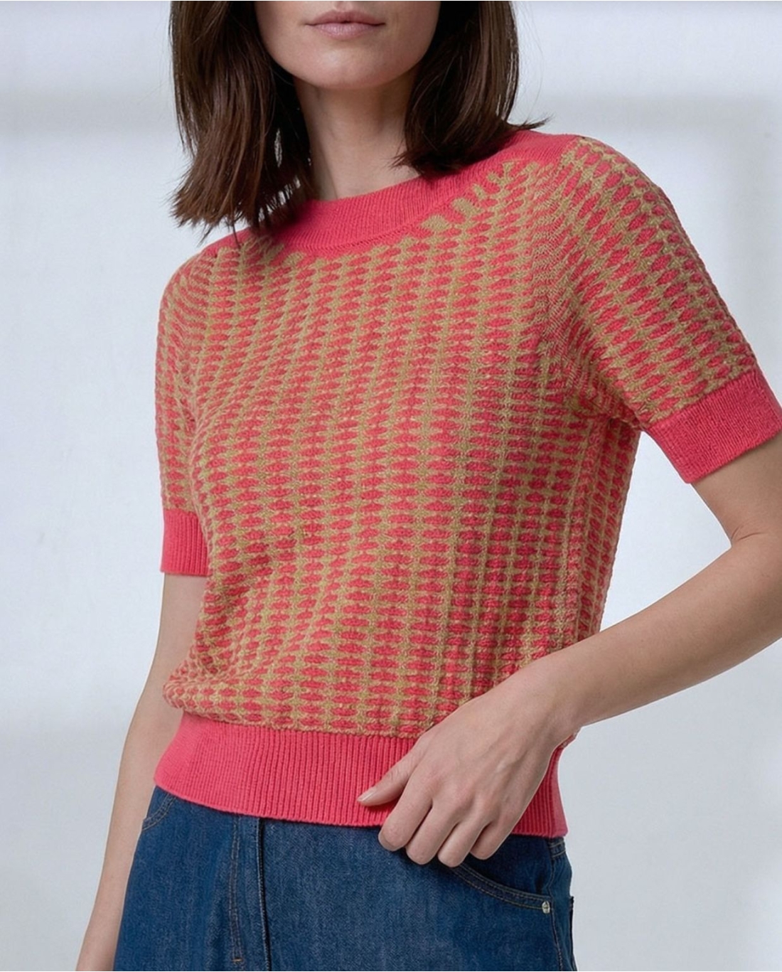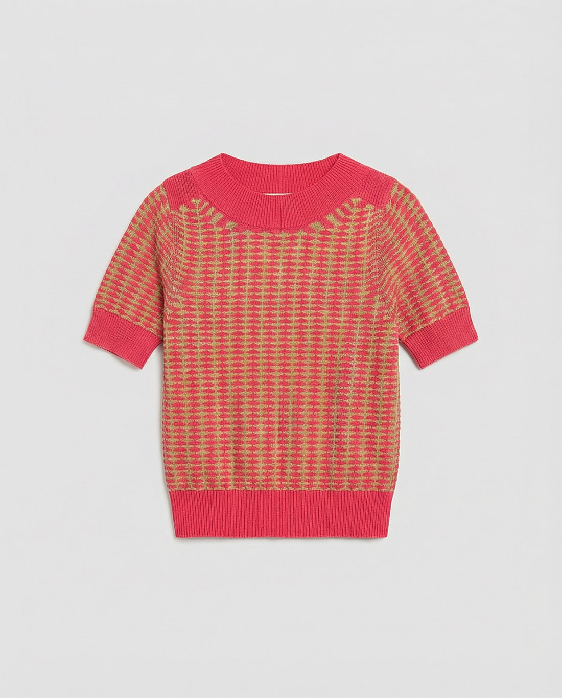 Suéter com decote canoa e mangas curtas. Modelagem reta com ombros estruturados e acabamento canelado na gola, nas mangas e na barra. Malha fina com textura regular integrada ao tecido. Comprimento até o quadril.