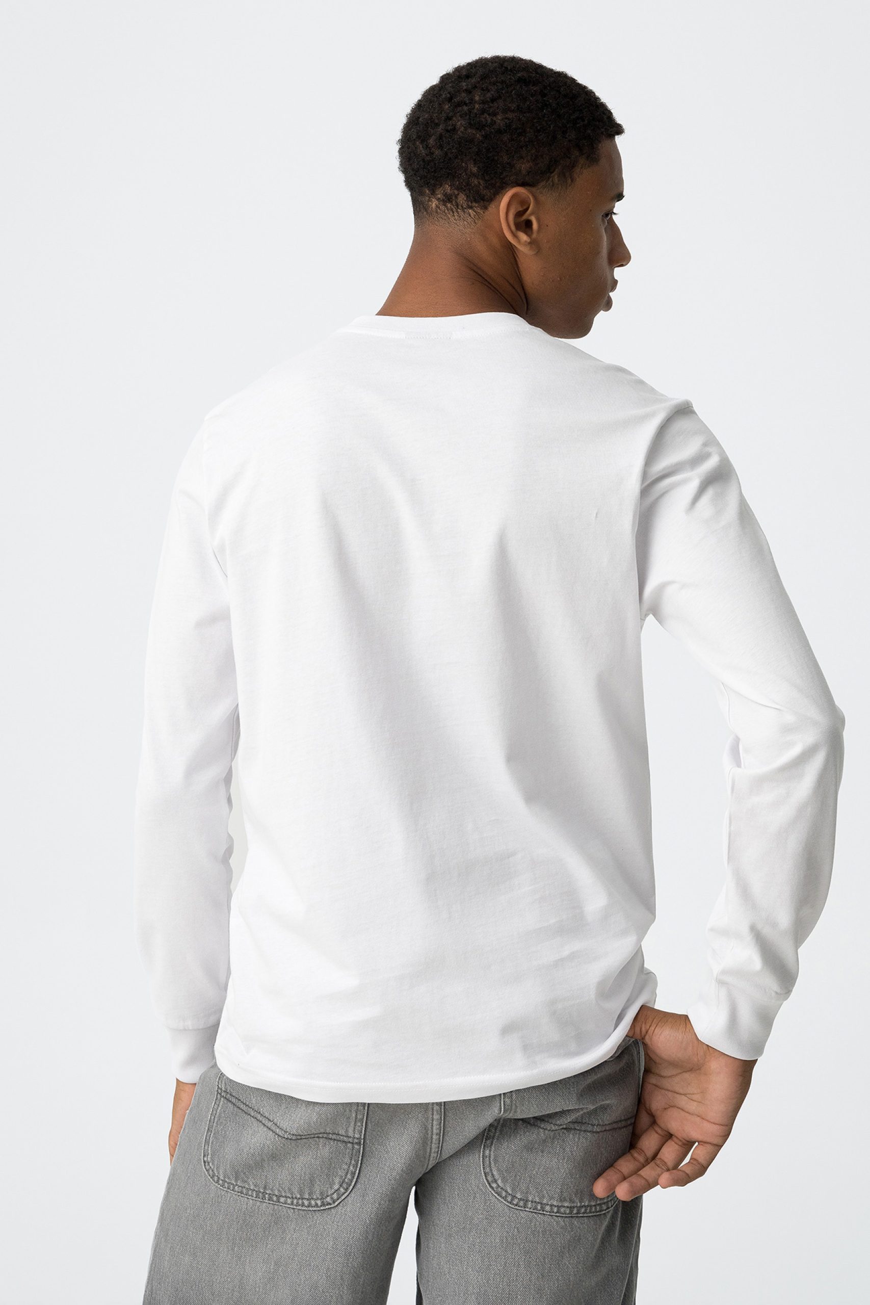 Gola redonda e manga longa.