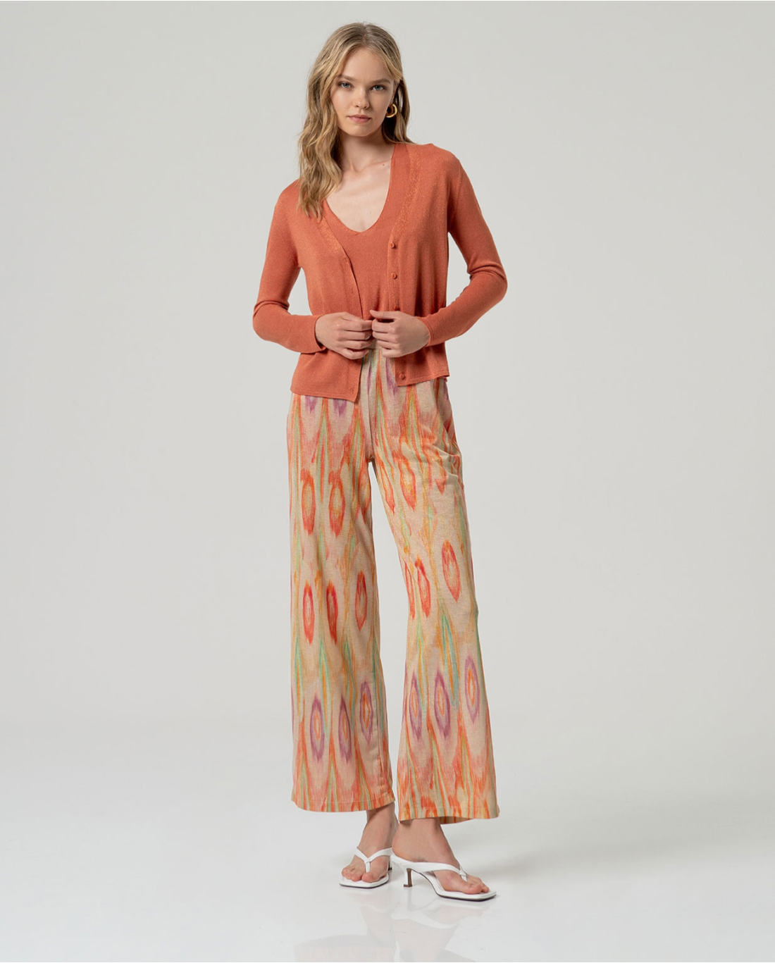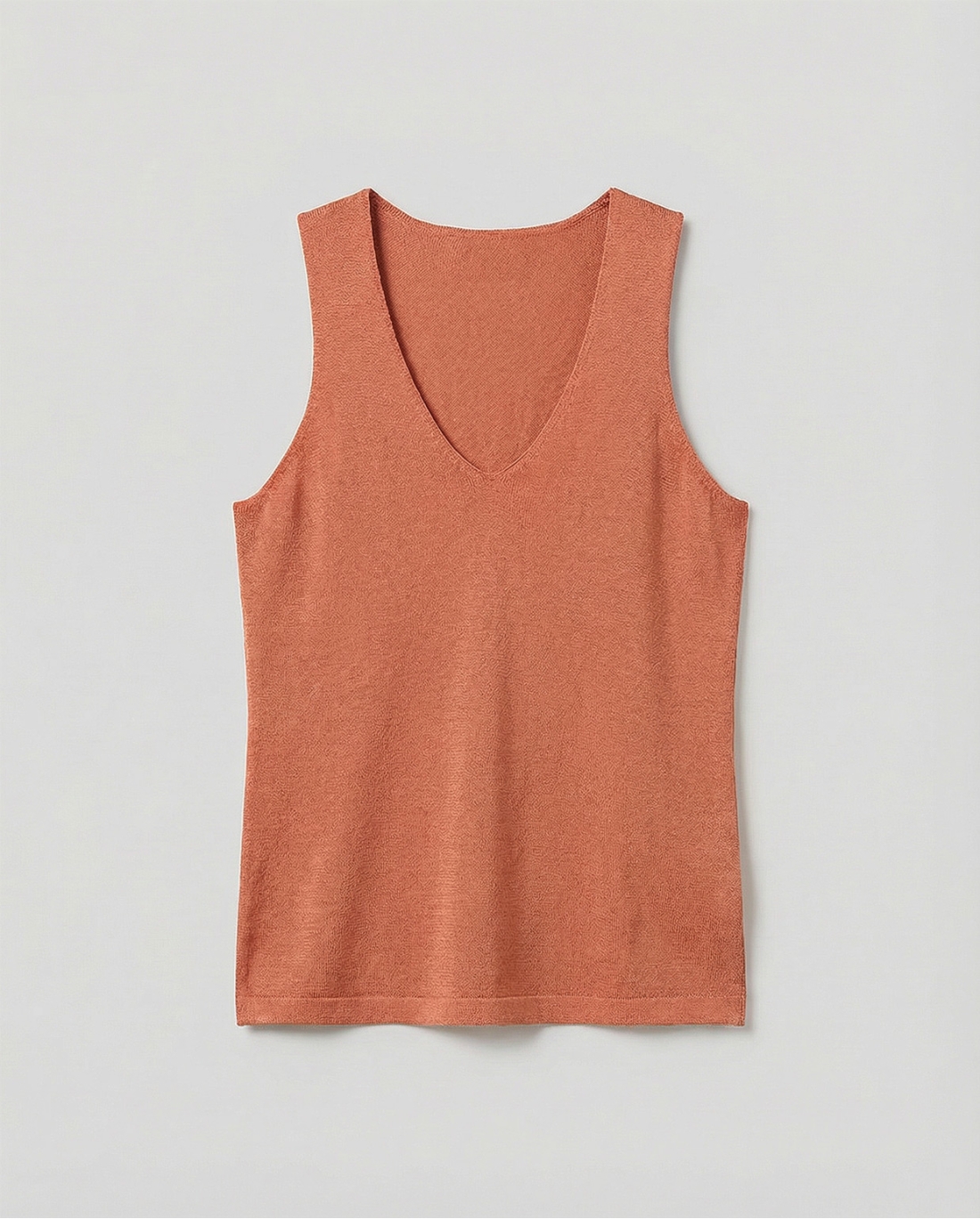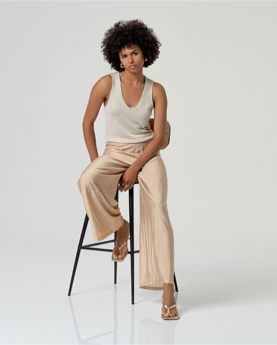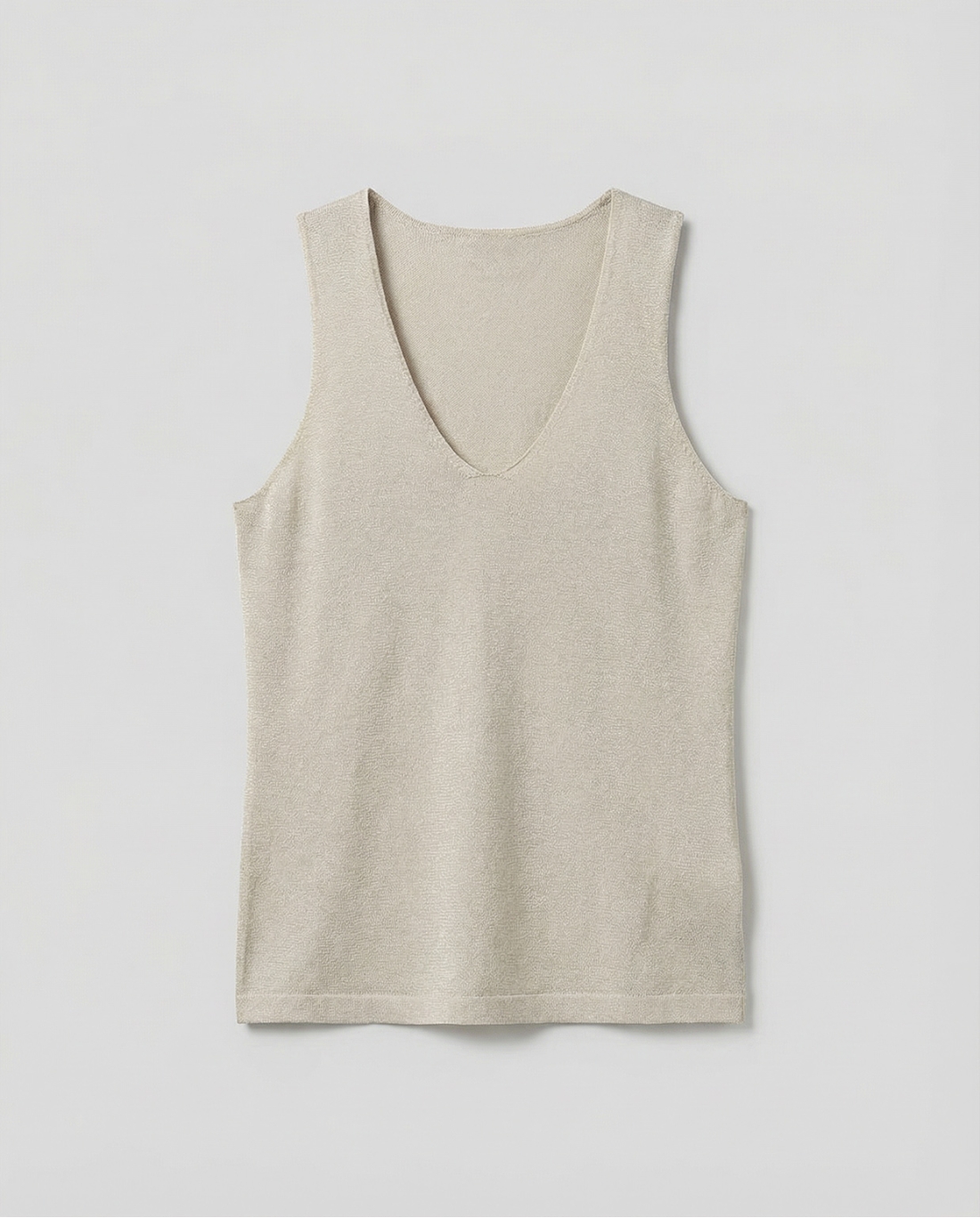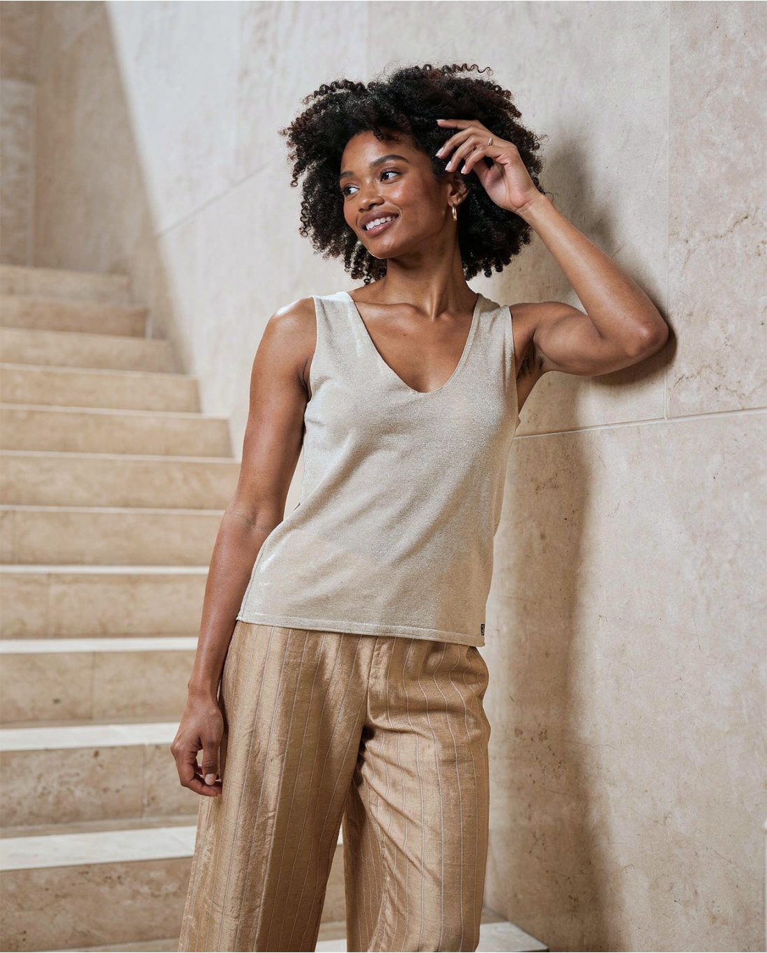 Regata com decote em V na frente e atrás. Design de silhueta reta com acabamentos limpos e estrutura simples. Feito de tecido fino e simples com fio de lurex. Projetado em Barcelona.