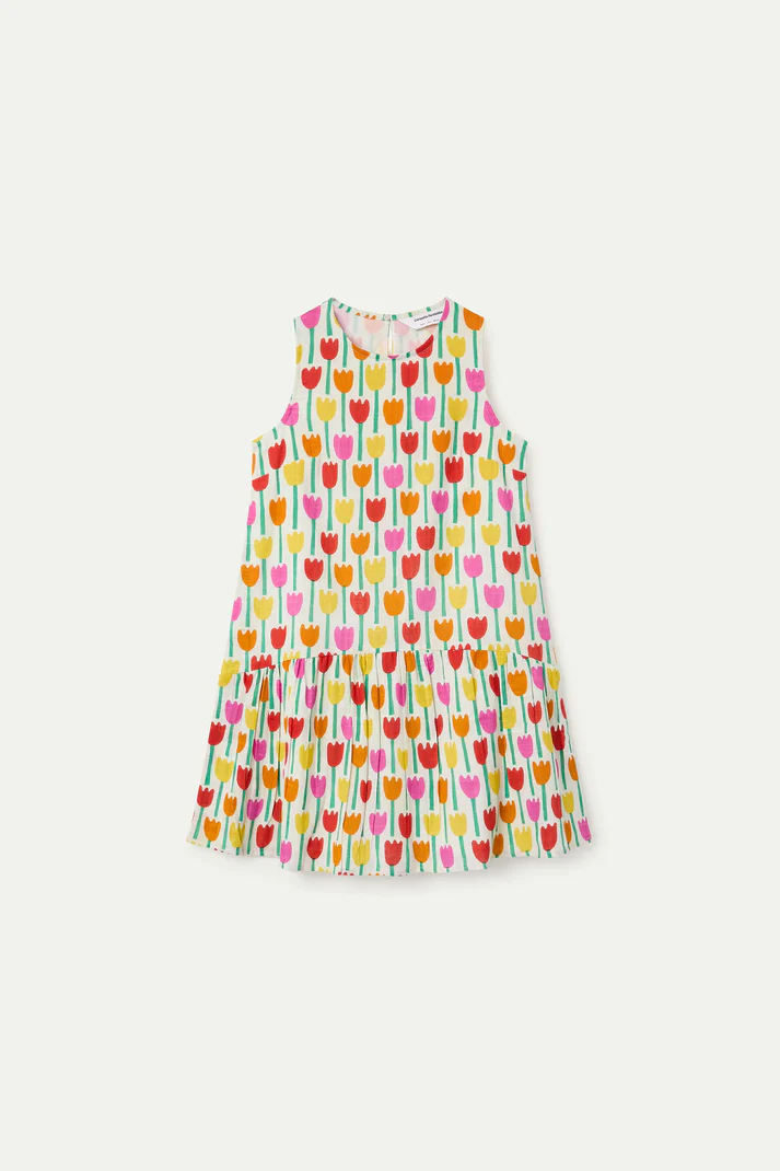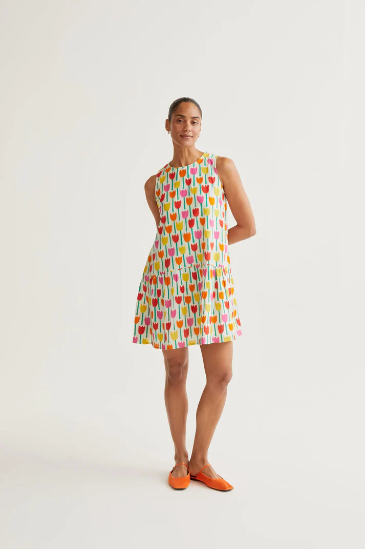 Vestido curto em 100% algodão com estampa de tulipas. Decote redondo e sem mangas. Fecho de botão invisível nas costas. Detalhe na saia. Caimento fluido. Forrado.